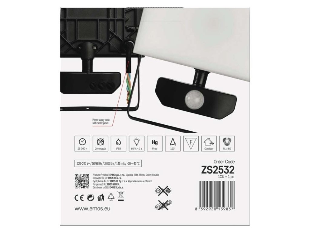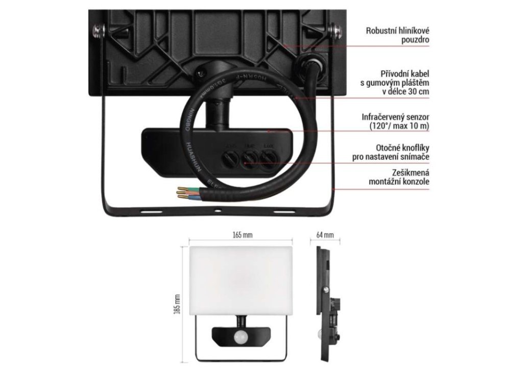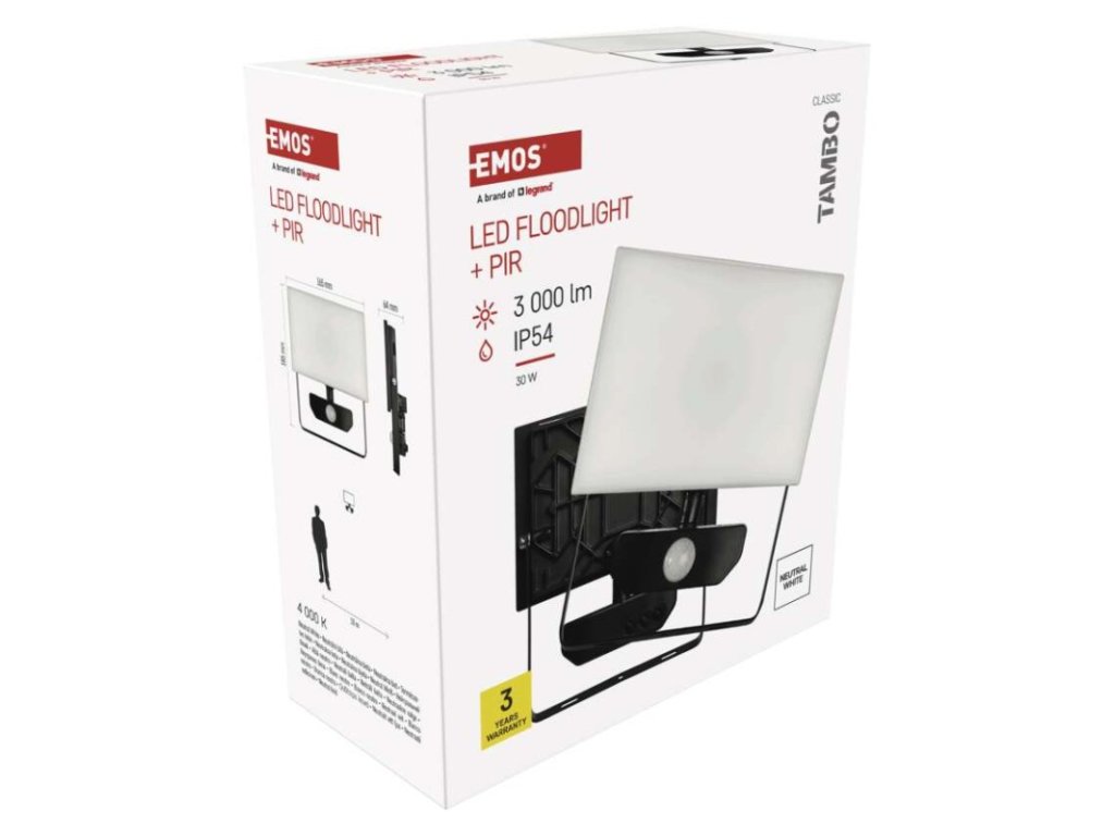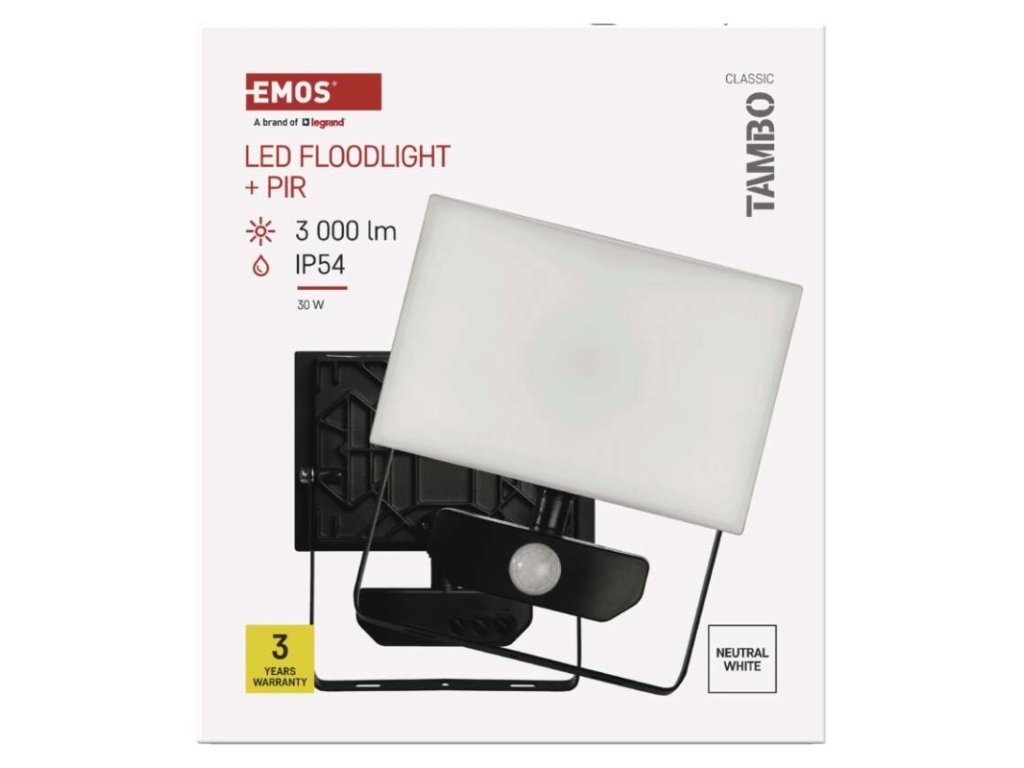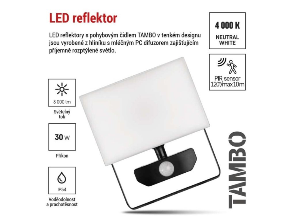 akumulátor: neuvádí se|barva: černá|barva světla: neutrální bílá|délka přívodního kabelu: 30 cm|doba svícení na AKU: neuvádí se|dosah PIR senzoru: 10 m|energetická třída použitého světelného zdroje: –|flicker-free: ano|frekvence: 50/60 Hz|index podání barev (CRI): Ra > 80|kategorie: CLASSIC|krytí: IP54|materiál difuzoru: plast (PC)|materiál přívodního kabelu: guma|materiál těla: hliník|napájení: ze sítě|napětí: 220–240 V~|PIR senzor: ano|počet průchozích zásuvek: 0|použití: povrchová montáž|příkon: 30 W|prodejní obal: 1 ks, krabice|proud: 135 mA|řada: TAMBO|rozměr: 165 × 185 × 64 mm|rozsah pracovní teploty: -20 °C až +40 °C|stmívání: ne|stupeň ochrany proti mechanickým nárazům: IK06|světelná účinnost: 100 lm/W|světelný tok: 3 000 lm|teplota chromatičnosti: 4 000 K|typ přívodního kabelu: neuvádí se|typ průchozích zásuvek: neuvádí se|typ stmívání: –|účiník: > 0,9|úhel vyzařování: 120°|záruční doba: 3 roky|zdroj světla: LED|životnost: 25 000 hodin|zkušební žárovka součástí balení: neDoplňkové parametry