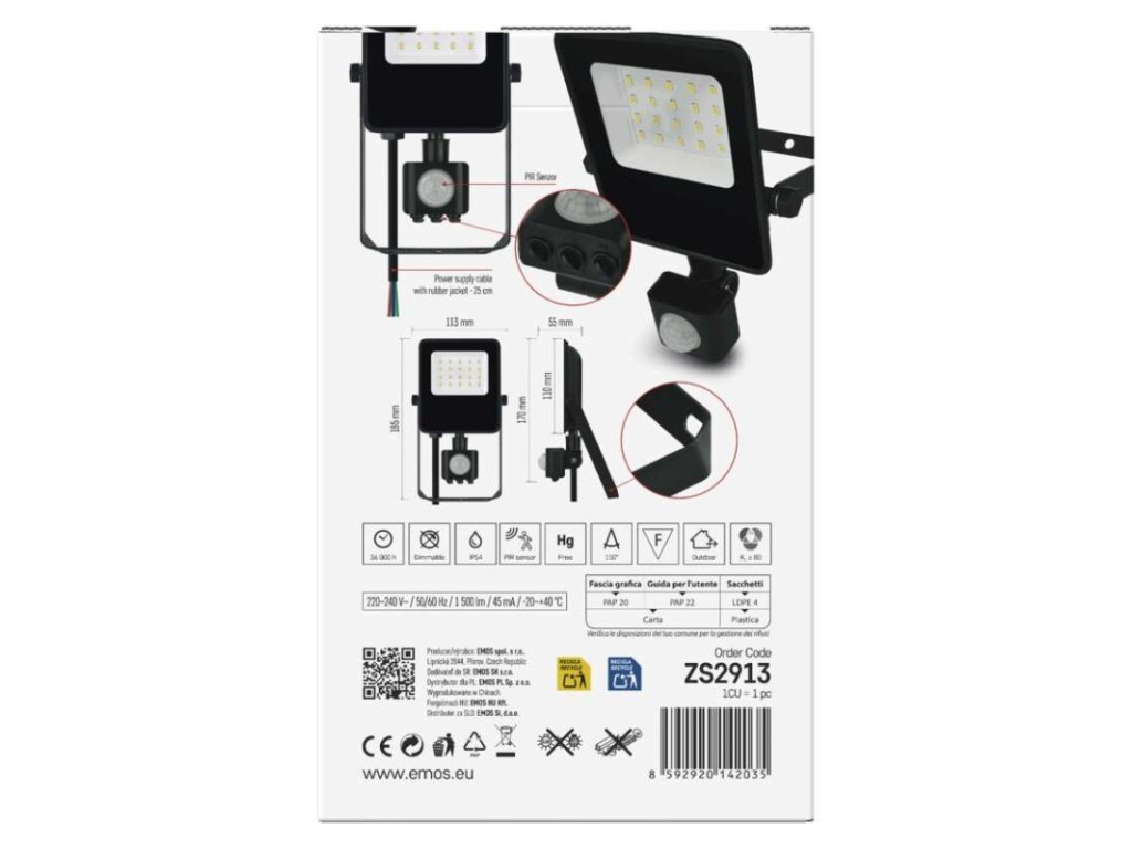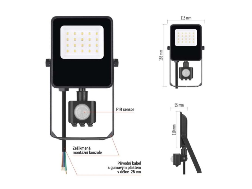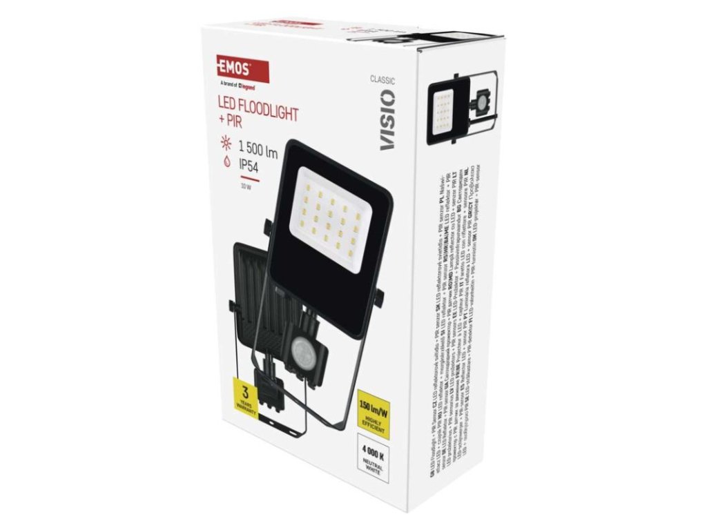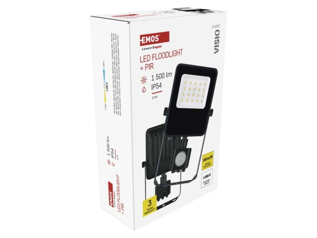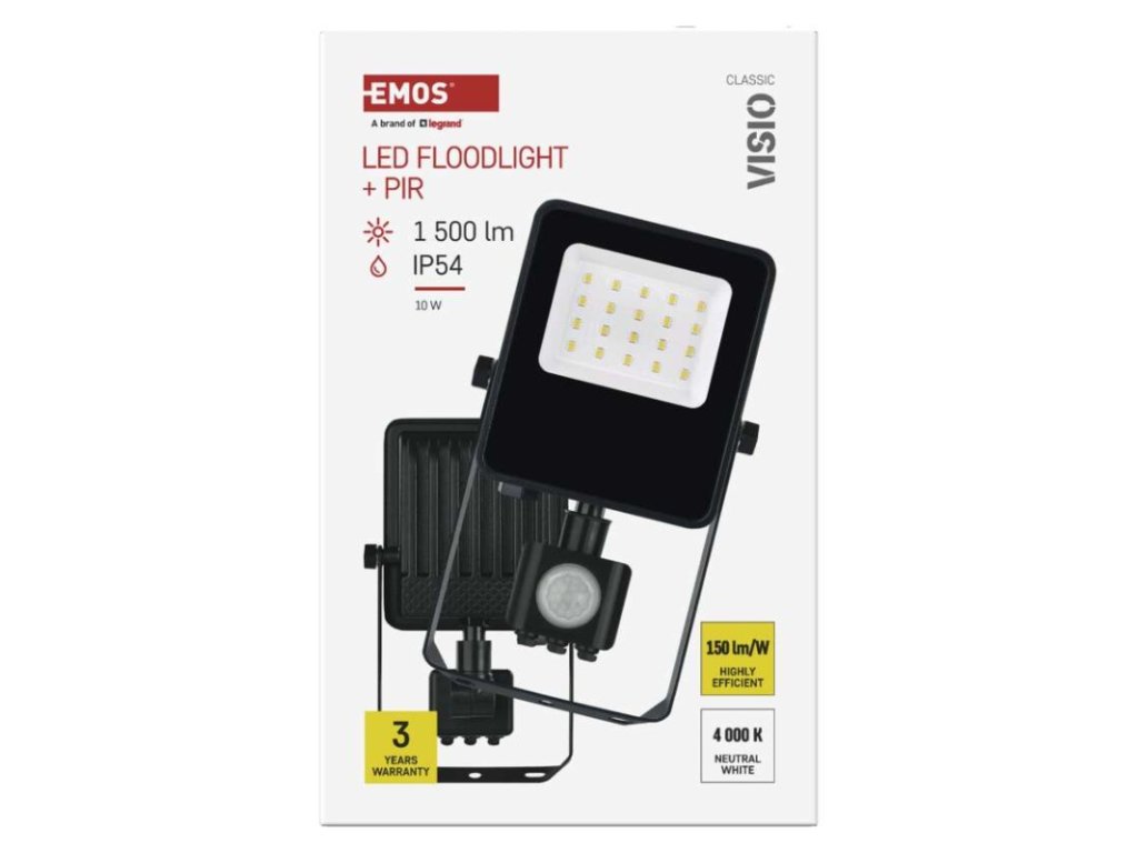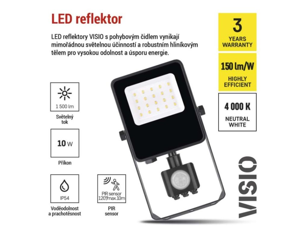 akumulátor: ne|barva: černá|barva světla: neutrální bílá|délka přívodního kabelu: 25 cm|doba svícení na AKU: –|dosah PIR senzoru: 10 m|energetická třída použitého světelného zdroje: –|flicker-free: ano|frekvence: 50/60 Hz|index podání barev (CRI): Ra > 80|kategorie: CLASSIC|krytí: IP54|materiál difuzoru: sklo|materiál přívodního kabelu: guma|materiál těla: hliník|napájení: ze sítě|napětí: 220–240 V~|PIR senzor: ano|počet průchozích zásuvek: –|použití: povrchová montáž|příkon: 10 W|prodejní obal: 1 ks, krabice|proud: 45 mA|řada: VISIO|rozměr: 113 × 185 × 55 mm|rozsah pracovní teploty: -20 °C až +40 °C|stmívání: ne|stupeň ochrany proti mechanickým nárazům: IK06|světelná účinnost: 150 lm/W|světelný tok: 1 500 lm|teplota chromatičnosti: 4 000 K|typ přívodního kabelu: H05RN-F|typ průchozích zásuvek: –|typ stmívání: –|účiník: > 0,9|úhel vyzařování: 110°|záruční doba: 3 roky|zdroj světla: LED|životnost: 36 000 hodin|zkušební žárovka součástí balení: neDoplňkové parametry