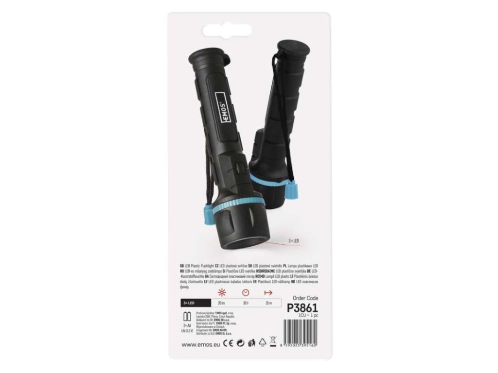 barva: černo-modrá|baterie součástí balení: ne|doba nabíjení: neuvádí se|doba svícení: 30 h|doba svícení detail: neuvádí se|dosvit: LED 100 % – 35 m|fokus: ne|hmotnost: 85 g|LED indikace nabíjení: neuvádí se|LED indikace stavu akumulátoru: neuvádí se|materiál: plast + guma|maximální dosvit: 35 m|maximální světelný tok: 20 lm|nabíjecí: ne|napájení: 2× AA|nárazuvzdornost: ano|počet režimů svícení: 1|příslušenství: neuvádí se|prodejní obal: 1 ks, papírový blistr|režimy svícení: LED 100 %|rozměr: 162 × 43 × 43 mm|speciální funkce: neuvádí se|světelný tok: LED 100 % – 20 lm|typ baterie: LR6 (1,5 V)|typ napájecího konektoru: neuvádí se|voděodolnost: ano (IP43)|vybavení: poutko|záruční doba: 2 roky|zdroj světla: LED|značka: EMOSDoplňkové parametry