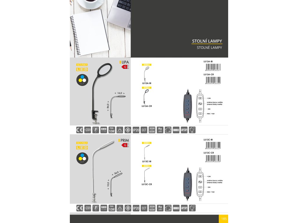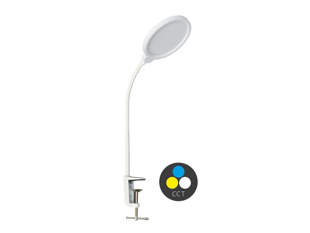 Jednoduchá kancelářská lampa určená k upevnění na hranu desky pracovního stolu. Využívá vysoce úspornou SMD LED technologii s dlouhou životností. Rameno lampy je ohebné a lze tak docílit pohodlného nastavení směru světla. Pomocí ovládacího prvku na přivodním kabelu je možné nastavit jas i požadovanou teplotu chromatičnosti v rozmezí 3000-6000K.Doplňkové parametry
