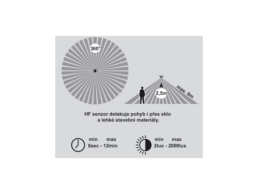 Jedinečné nástěnné a stropní svítidlo VICTOR LED je vybaveno HF senzorem pohybu a setmění a využívá vysoce úspornou LED technologii (čip SMD2835). Oproti standardnímu modelu navíc disponuje nouzovým modulem s vestavěnou baterií. Díky vyššímu krytí lze umístit i do exteriérů na strop i stěnu. Úhel pokrytí je celých 360˚ a dosah senzoru je až 9 metrů při montážní výšce 2,5m. Pomocí 3 otočných ovladačů je možné nastavit citlivost senzorů a čas sepnutí. Využití najde např: chodby paneláků, WC, schodiště, sklepy, vchody do budov, obchody, nemocnice, sklady, úřady, osvětlení vchodových dveří, předsíní atd. Senzor pohybu: HF čidlo pohybu funguje na principu mikrovln, které detekují pohyb i přes sklo a lehké stavební materiály.Doplňkové parametry