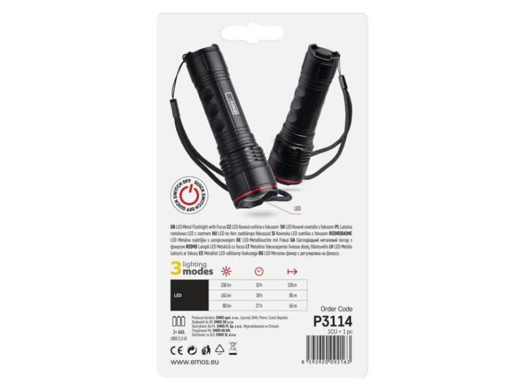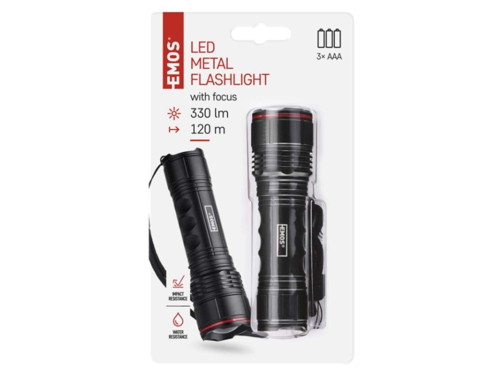 barva: černá|baterie součástí balení: ne|doba nabíjení: neuvádí se|doba svícení: 10–27 h|doba svícení detail: LED 100 % – 10 h, LED 50 % – 18 h, LED 25 % – 27 h|dosvit: LED 100 % – 120 m, LED 50 % – 85 m, LED 25 % – 65 m|fokus: ano|hmotnost: 121 g|LED indikace nabíjení: neuvádí se|LED indikace stavu akumulátoru: neuvádí se|materiál: hliník|maximální dosvit: 120 m|maximální světelný tok: 330 lm|nabíjecí: ne|napájení: 3× AAA|nárazuvzdornost: ano|počet režimů svícení: 3|příslušenství: neuvádí se|prodejní obal: 1 ks, papírový blistr|režimy svícení: LED 100 %, LED 50 %, LED 25 %|rozměr: 128 × 37 × 37 mm|speciální funkce: funkce rychlého vypnutí|světelný tok: LED 100 % – 330 lm, LED 50 % – 165 lm, LED 25 % – 80 lm|typ baterie: LR03 (1,5 V)|typ napájecího konektoru: neuvádí se|voděodolnost: ano (IP44)|vybavení: poutko|záruční doba: 2 roky|zdroj světla: LED|značka: EMOSDoplňkové parametry