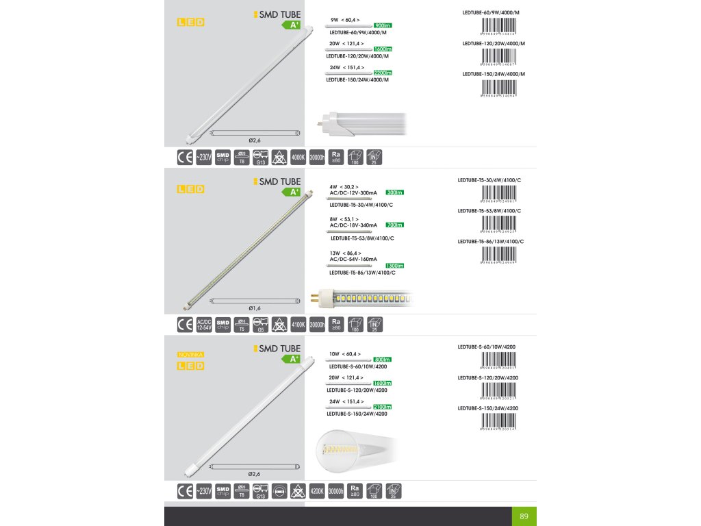 Zářivky LEDTUBE přináší nejúspornější svícení např. do kuchyňských nebo technických svítidel. Využívají moderní LED technologii SMD. Mají okamžitý náběh a zajistí při minimální spotřebě dvojnásobnou účinnost oproti konvenčním trubicím. Tyto modely nejsou určené ke stmívání. Obrovskou výhodou je jejich životnost, která dosahuje 30.000. V sortimentu nabízíme modely s výkonem od 9W do 24W.Doplňkové parametry