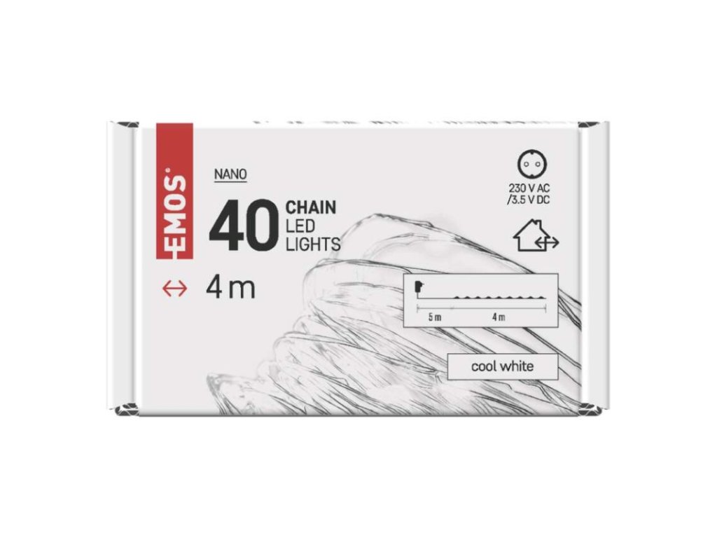 barva drátu: stříbrná|barva světla: studená bílá|časovač: ano|dálkový ovladač: ne|délka přívodu: 5 m|funkce: svítí|krytí: IP44|LED mezera: 10 cm|materiál: kov|možnost propojení: ne|počet LED: 40|použití: venkovní i vnitřní|příkon: 2,1 W|prodejní obal: 1 ks, krabice|produkt: nano řetěz|pro výšku stromu: 100 cm|rozměr: 4 m|tvar: nano|typ napájení: síťový adaptér|velikost LED: 3 mm (nano)|vstupní napětí: 230 V AC|výstupní napětí: 3,5 V DC|záruční doba: 2 roky|životnost: 10 000 hodinDoplňkové parametry