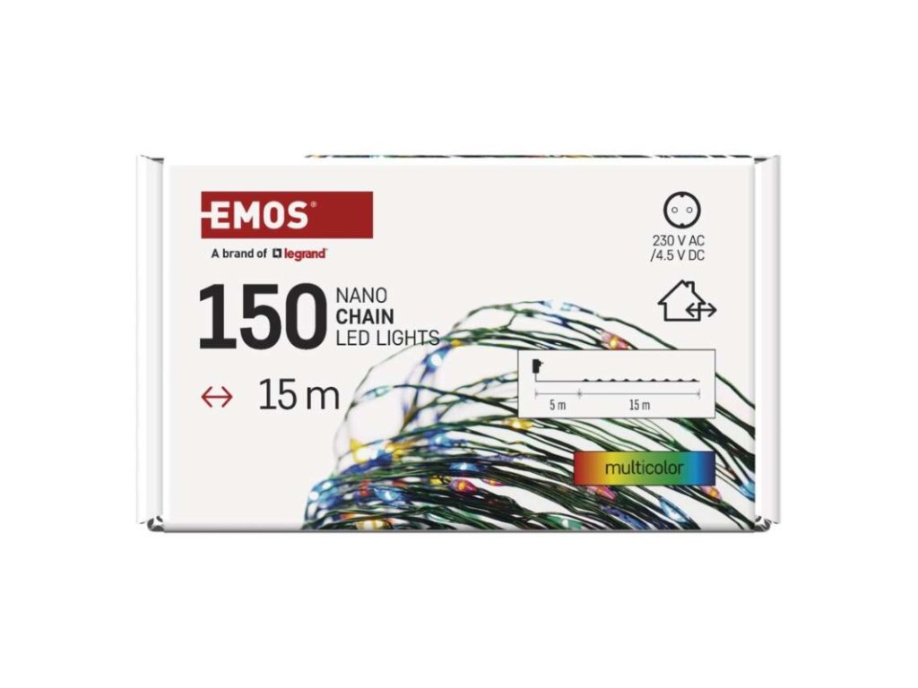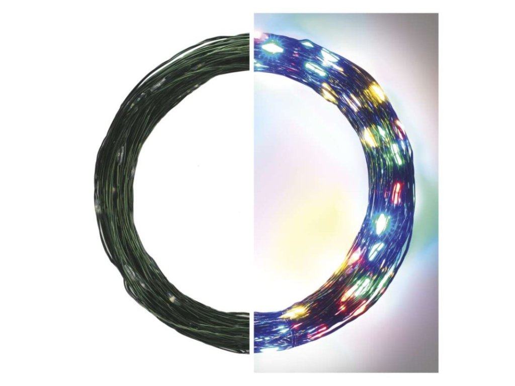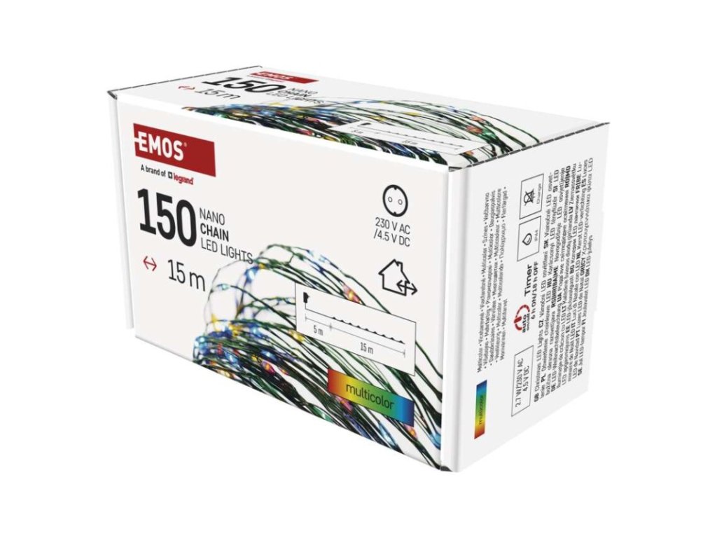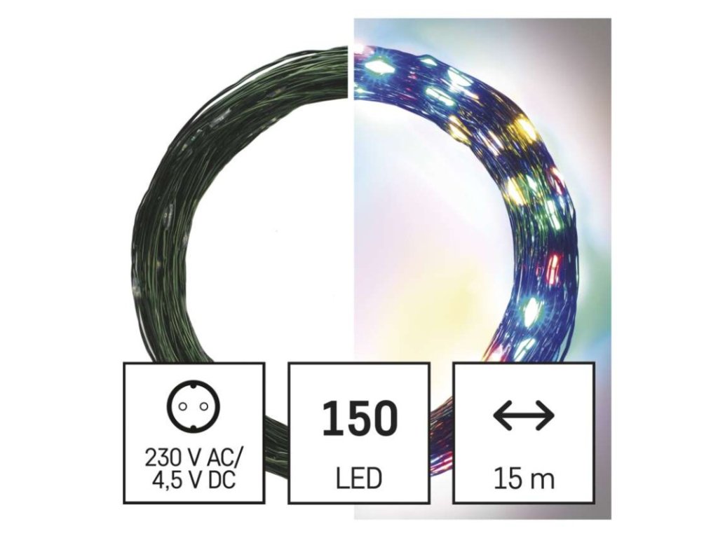 barva drátu: zelená|barva světla: multicolor|časovač: ano|dálkový ovladač: ne|délka přívodu: 5 m|funkce: svítí|krytí: IP44|LED mezera: 10 cm|materiál: kov|možnost propojení: ne|počet LED: 150|použití: venkovní i vnitřní|příkon: 2,7 W|prodejní obal: 1 ks, krabice|produkt: nano řetěz|pro výšku stromu: 170 cm|rozměr: 15 m|tvar: nano|typ napájení: síťový adaptér|velikost LED: 3 mm (nano)|vstupní napětí: 230 V AC|výstupní napětí: 4,5 V DC|záruční doba: 2 roky|životnost: 10 000 hodinDoplňkové parametry