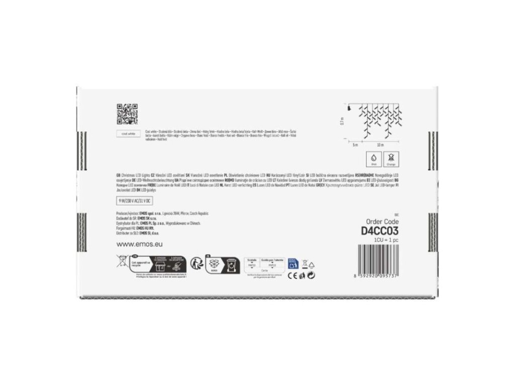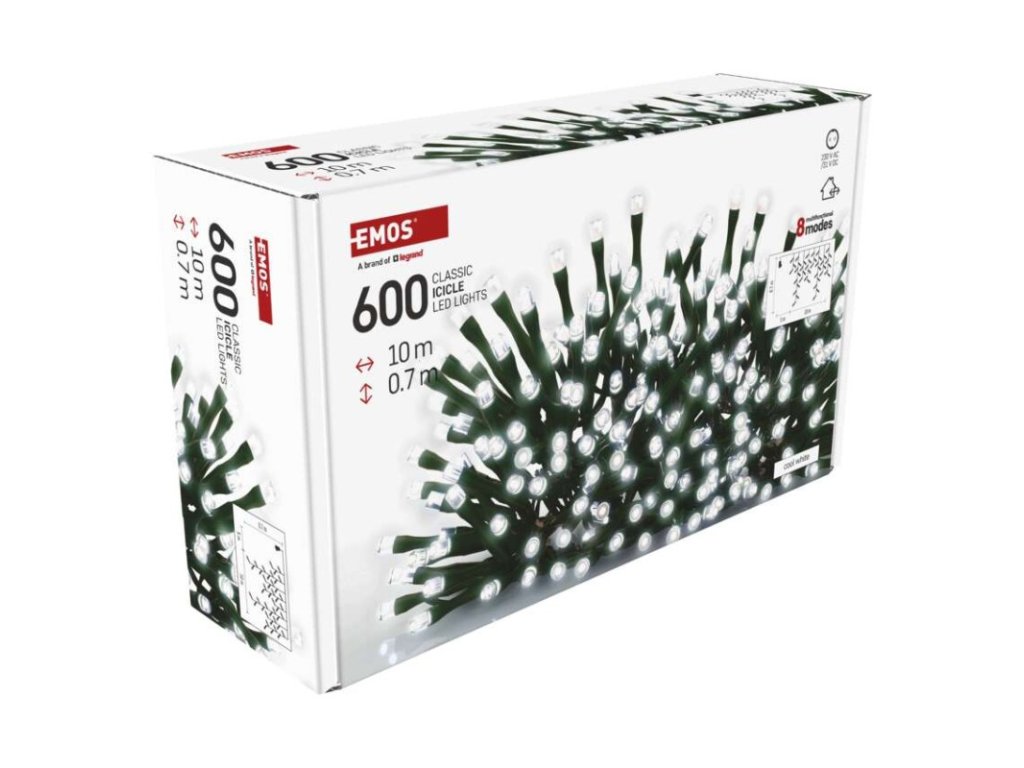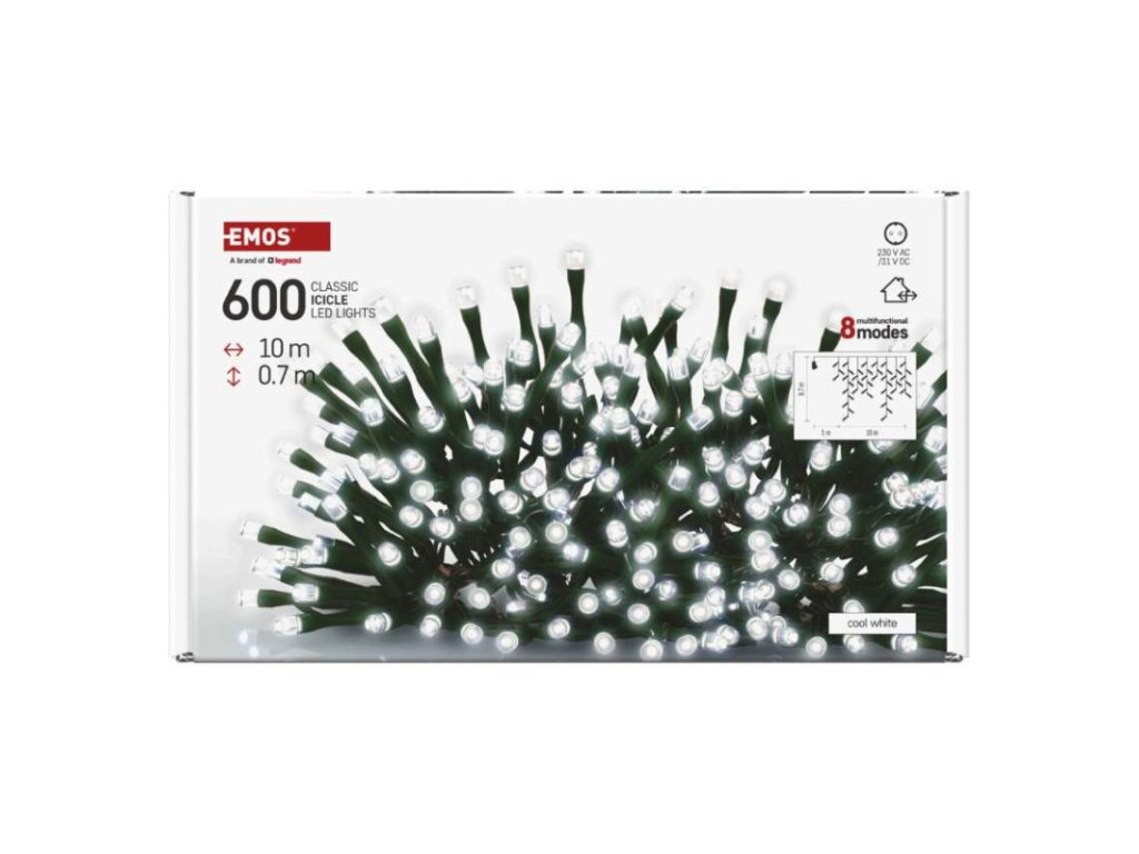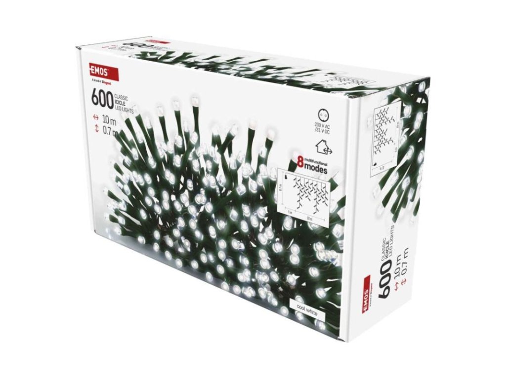 barva drátu: zelená|barva světla: studená bílá|časovač: ne|dálkový ovladač: ne|délka přívodu: 5 m|funkce: 8 módů (multifunkce)|krytí: IP44|LED mezera: 10 cm|materiál: PVC|možnost propojení: ne|počet LED: 600|použití: venkovní i vnitřní|příkon: 9 W|prodejní obal: 1 ks, krabice|produkt: krápníky|pro výšku stromu: neuvádí se|rozměr: 10 × 0,7 m|tvar: klasický|typ napájení: síťový adaptér|velikost LED: 5 mm|vstupní napětí: 230 V AC|výstupní napětí: 31 V DC|záruční doba: 2 roky|životnost: 10 000 hodinDoplňkové parametry