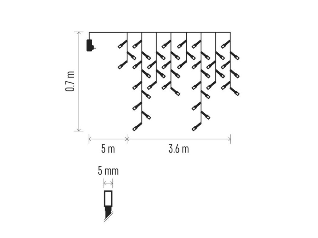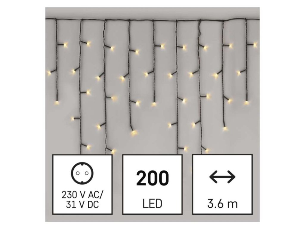 barva drátu: zelená|barva světla: teplá bílá|časovač: ne|dálkový ovladač: ne|další funkce: –|délka přívodu: 5 m|funkce: 8 módů (multifunkce)|jazyky aplikace: –|kompatibilita: –|krytí: IP44|LED mezera: 10 cm|materiál: PVC|možnost propojení: ne|notifikace do mobilní aplikace: –|ovládání hlasovými asistenty: –|počet LED: 200|podporované OS: –|použití: venkovní i vnitřní|přenosová frekvence: –|příkon: 3,6 W|prodejní obal: 1 ks, krabice|produkt: krápníky|protokol: –|pro výšku stromu: neuvádí se|rozměr: 3,6 × 0,7 m|tvar: klasický|typ napájení: síťový adaptér|velikost LED: 5 mm|vstupní napětí: 230 V AC|výstupní napětí: 31 V DC|záruční doba: 2 roky|životnost: 10 000 hodinDoplňkové parametry