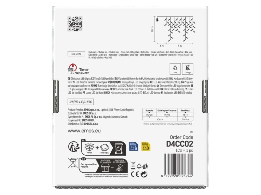 barva drátu: transparentní|barva světla: studená bílá|časovač: ano|dálkový ovladač: ano (1× CR2032, součástí balení)|délka přívodu: 5 m|funkce: 8 módů (multifunkce)|krytí: IP44|LED mezera: 10 cm|materiál: PVC|možnost propojení: ne|počet LED: 300|použití: venkovní i vnitřní|příkon: 6 W|prodejní obal: 1 ks, krabice|produkt: krápníky|pro výšku stromu: neuvádí se|rozměr: 5 × 0,7 m|tvar: klasický|typ napájení: síťový adaptér|velikost LED: 5 mm|vstupní napětí: 230 V AC|výstupní napětí: 31 V DC|záruční doba: 2 roky|životnost: 10 000 hodinDoplňkové parametry