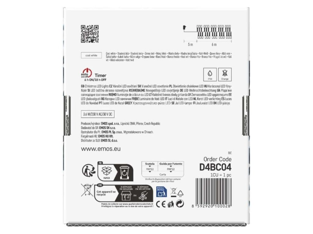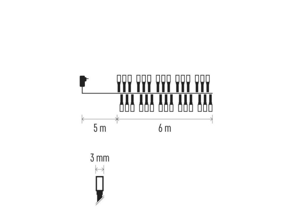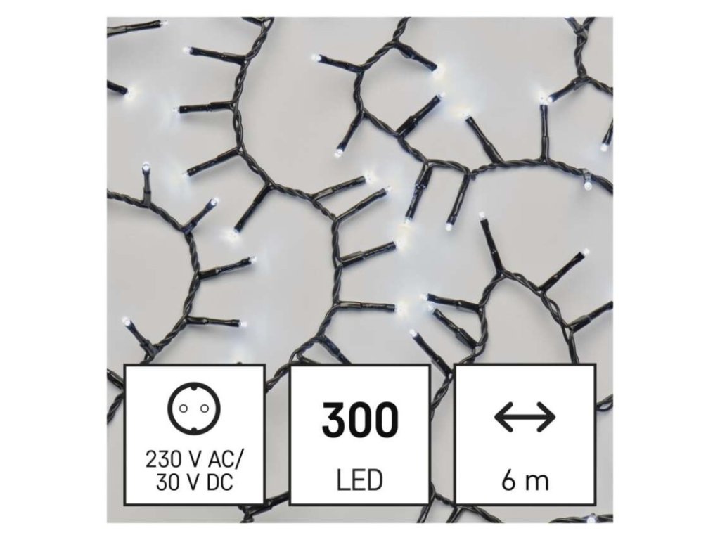 barva drátu: černá|barva světla: studená bílá|časovač: ano|dálkový ovladač: ne|délka přívodu: 5 m|funkce: svítí|krytí: IP44|LED mezera: 2 cm|materiál: PVC|možnost propojení: ne|počet LED: 300|použití: venkovní i vnitřní|příkon: 3,6 W|prodejní obal: 1 ks, krabice|produkt: ježek|pro výšku stromu: neuvádí se|rozměr: 6 m|tvar: klasický|typ napájení: síťový adaptér|velikost LED: 3 mm|vstupní napětí: 230 V AC|výstupní napětí: 30 V DC|záruční doba: 2 roky|životnost: 10 000 hodinDoplňkové parametry