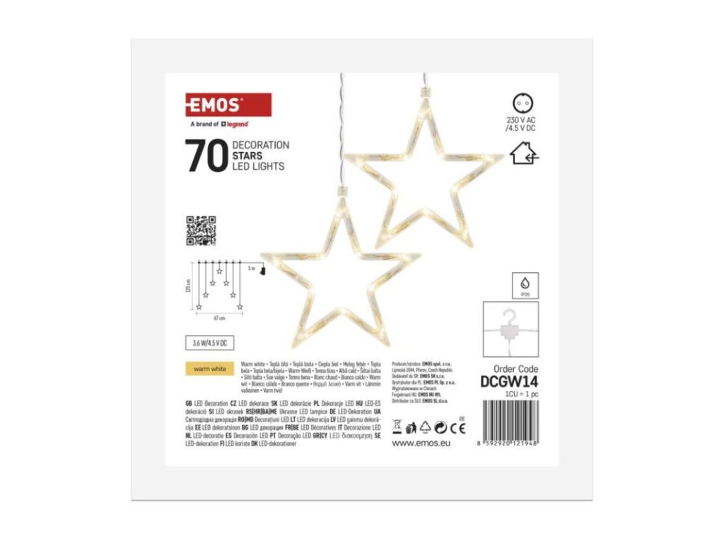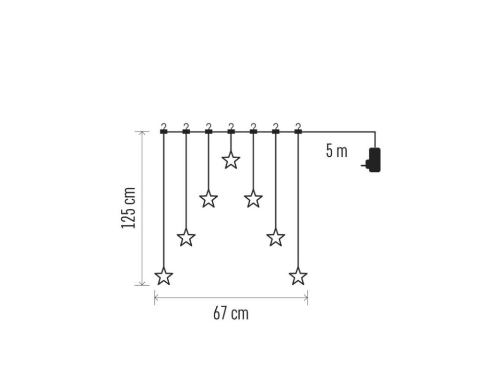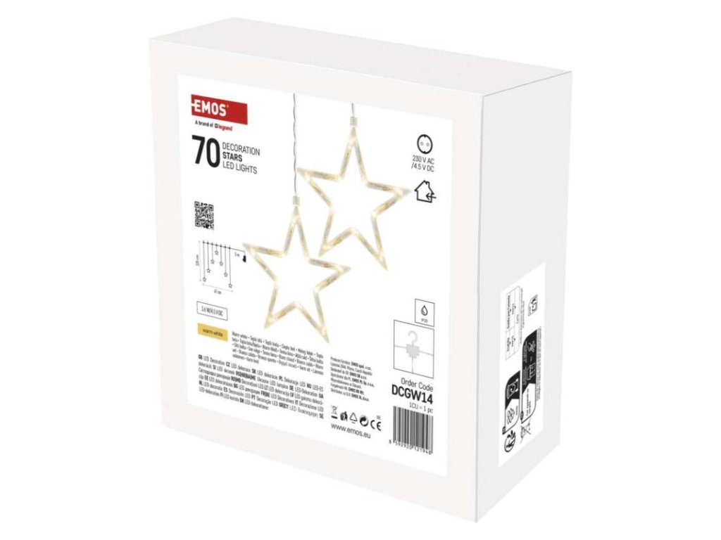 barva drátu: neuvádí se|barva světla: teplá bílá|časovač: ne|dálkový ovladač: ne|délka přívodu: 5 m|funkce: svítí|krytí: IP20|LED mezera: neuvádí se|materiál: neuvádí se|možnost propojení: ne|počet LED: 70|použití: vnitřní|příkon: 3,6 W|prodejní obal: 1 ks, krabice|produkt: girlanda|pro výšku stromu: neuvádí se|rozměr: 67 × 125 cm|tvar: hvězdy|typ napájení: síťový adaptér|velikost LED: neuvádí se|vstupní napětí: 230 V AC|výstupní napětí: 4,5 V DC|záruční doba: 2 roky|životnost: 10 000 hodinDoplňkové parametry