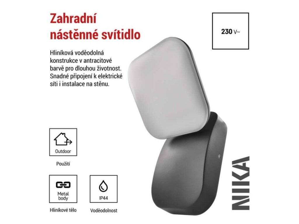 barva: antracit|barva světla: teplá bílá|dosah PIR senzoru: –|energetická třída použitého světelného zdroje: G|fotovoltaický článek: ne|frekvence: 50/60 Hz|index podání barev (CRI): > 80|kategorie: CLASSIC|krytí: IP44|materiál: hliník|materiál difuzoru: plast|napájení: 230 V AC|napětí: 220-240 V~|patice (uchycení žárovky): –|PIR senzor: ne|příkon: 12,5 W|prodejní obal: 1 ks, krabička|řada: NIKA|rozměr: 120 × 120 × 200 mm|rozsah pracovní teploty: -20 ~ +40 °C|soumrakový spínač: ne|světelný tok: 900 lm|teplota chromatičnosti: 3000 K|vestavěný vypínač: ne|žárovka součástí balení: –|zdroj světla: LED|životnost: 25 000 hDoplňkové parametry