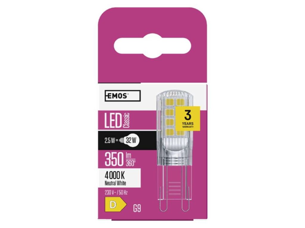 barva světla: neutrální bílá|energetická třída: D|index podání barev (CRI): 80|kompatibilita: –|náhrada za žárovku: 32 W|napětí: 230 V~/50 Hz|notifikace do mobilní aplikace: –|ovládání hlasovými asistenty: –|patice (uchycení žárovky): G9|počet čipů: 18|počet spínacích cyklů: 25 000|podporované OS: –|přenosová frekvence: –|příkon: 2,5 W|prodejní obal: 1 ks, krabička|protokol: –|řada: CLASSIC|rozměr: 47 × 14 × 14 mm|stmívatelná: ne|světelná účinnost: 140 lm/W|světelný tok: 350 lm|technologie: LED|teplota chromatičnosti: 4 000 K|tvar: JC|typ čipů: SMD|účiník: 0,58|úhel vyzařování: 320°|záruční doba: 3 roky|životnost: 30 000 hodinDoplňkové parametry