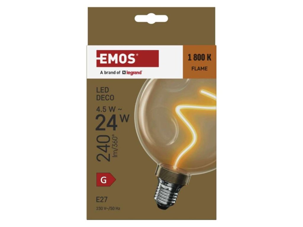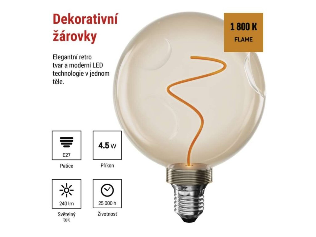 barva světla: Flame|energetická třída: G|index podání barev (CRI): 80|kompatibilita: neuvádí se|náhrada za žárovku: 24 W|napětí: 230 V~/50 Hz|notifikace do mobilní aplikace: neuvádí se|ovládání hlasovými asistenty: neuvádí se|patice (uchycení žárovky): E27|počet čipů: neuvádí se|počet spínacích cyklů: 25 000|podporované OS: neuvádí se|přenosová frekvence: neuvádí se|příkon: 4,5 W|prodejní obal: 1 ks, krabička|protokol: neuvádí se|řada: DECO|rozměr: 125 × 125 × 164 mm|stmívatelná: ne|světelná účinnost: 53 lm/W|světelný tok: 240 lm|technologie: LED|teplota chromatičnosti: 1 800 K|tvar: CG125A|typ čipů: COB|účiník: 0,40|úhel vyzařování: 330°|záruční doba: 2 roky|životnost: 25 000 hodinDoplňkové parametry