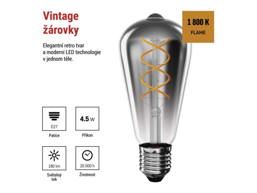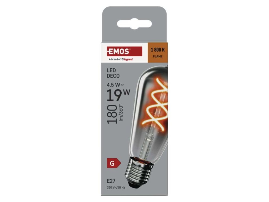 barva světla: Flame|energetická třída: G|index podání barev (CRI): 80|kompatibilita: –|náhrada za žárovku: 19 W|napětí: 230 V~/50 Hz|notifikace do mobilní aplikace: –|ovládání hlasovými asistenty: –|patice (uchycení žárovky): E27|počet čipů: –|počet spínacích cyklů: 25 000|podporované OS: –|přenosová frekvence: –|příkon: 4,5 W|prodejní obal: 1 ks, krabička|protokol: –|řada: DECO|rozměr: 64 × 64 × 140 mm|stmívatelná: ne|světelná účinnost: 40 lm/W|světelný tok: 180 lm|technologie: LED|teplota chromatičnosti: 1 800 K|tvar: ST64|typ čipů: COB|účiník: 0,40|úhel vyzařování: 320°|záruční doba: 2 roky|životnost: 25 000 hodinDoplňkové parametry