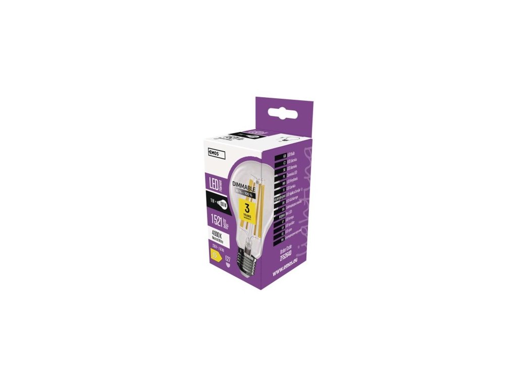 barva světla: neutrální bílá|energetická třída: D|index podání barev (CRI): 80|kompatibilita: –|náhrada za žárovku: 100 W|napětí: 230 V~/50 Hz|notifikace do mobilní aplikace: –|ovládání hlasovými asistenty: –|patice (uchycení žárovky): E27|počet čipů: neuvádí se|počet spínacích cyklů: 25 000|podporované OS: –|přenosová frekvence: –|příkon: 11 W|prodejní obal: 1 ks, krabička|protokol: –|řada: FILAMENT|rozměr: 60 × 60 × 108 mm|stmívatelná: ano|světelná účinnost: 138 lm/W|světelný tok: 1 521 lm|technologie: LED|teplota chromatičnosti: 4 000 K|tvar: A60|typ čipů: COB|účiník: 0,95|úhel vyzařování: 320°|záruční doba: 3 roky|životnost: 25 000 hodinDoplňkové parametry