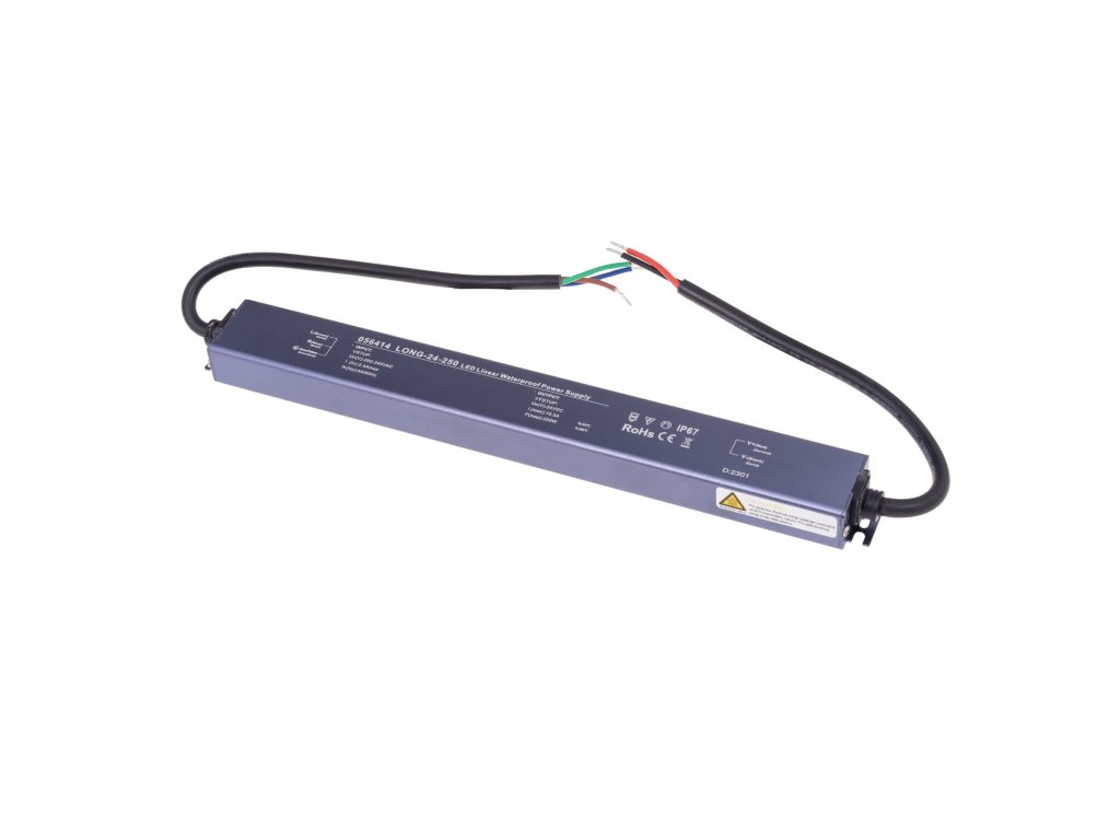 Elektronický napěťový spínaný zdroj pro LED řady LONG v krytí IP67, který je vhodný především pro LED osvětlení. Zdroje LONG jsou velmi úzké, díky čemuž je vhodný do míst, kde potřebujete šetřit místem (uvnitř svítidel, nábytek apod.). Zdroj je ideální jako napájení pro 24VDC LED produkty jako jsou například LED pásky, LED žárovky a další LED osvětlení. LED zdroj pro LED pásky 24V 250W je opatřen: tepelnou pojistkou pojistkou proti zkratu (po odstranění zkratu je opět plně funkční) pojistkou proti přetížení Specifikace LED zdroje Vstupní napětí 200 - 240V AC Výstupní napětí 24V DC/10,5A Pojistka tepelná, proti zkratu, proti přetížení Výkon 250W* Startovací proud 70A Krytí IP67 Třída izolace II Rozměry 307x36x23mm * !!! Upozornění !!! max. trvalé doporučené zatížení je s min. 20% rezervou pro běžné užívání, pro instalaci do komerčních prostor s dobou používání 8 a více hodin denně nepřetržitě je doporučené trvalé zatížení vzhledem k účinnosti spínaných zdrojů s min. 30% rezervou , aby byla zachována nejdelší životnost zdroje.Doplňkové parametry