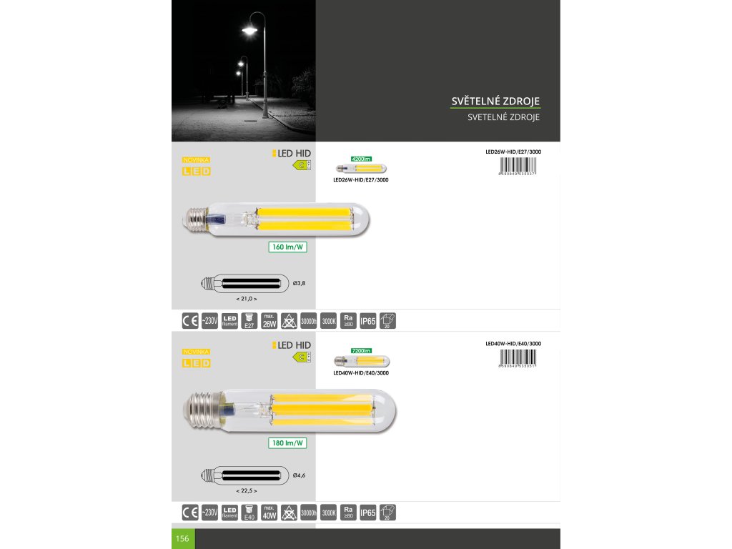 Filamentové žárovky LED HID s paticí E27 představují retrofitní řešení pro starší instalace pouličního a veřejného osvětlení nebo do masivních těles osvětlujících skladové či výrobní prostory. LED technologie zajistí proti původnímu zdroji nesrovnatelnou úsporu a minimalizuje náklady pro revitalizaci osvětlení.Doplňkové parametry