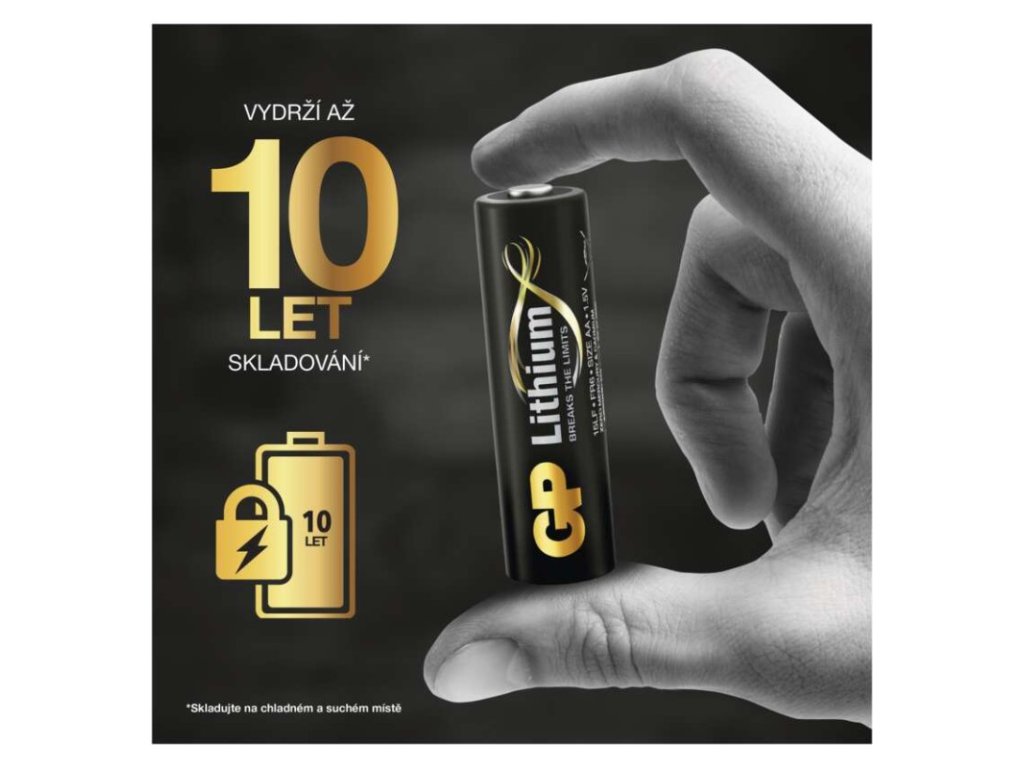 chemické složení: lithiové|hmotnost: 14,5 g|kapacita: neuvádí se|kategorie/řada: Lithium|max. skladovatelnost: 10 let|možnost nabíjení: ne|napětí: 1,5 V|počet nabíjecích cyklů: nenabíjecí|prodejní obal: 2 ks, blistr|provozní teplota: -40 °C až +60 °C|rozměr: 14,5 × 50,5 mm|typ: FR6 (tužka, AA)|velikost baterie: AA|značka: GPDoplňkové parametry