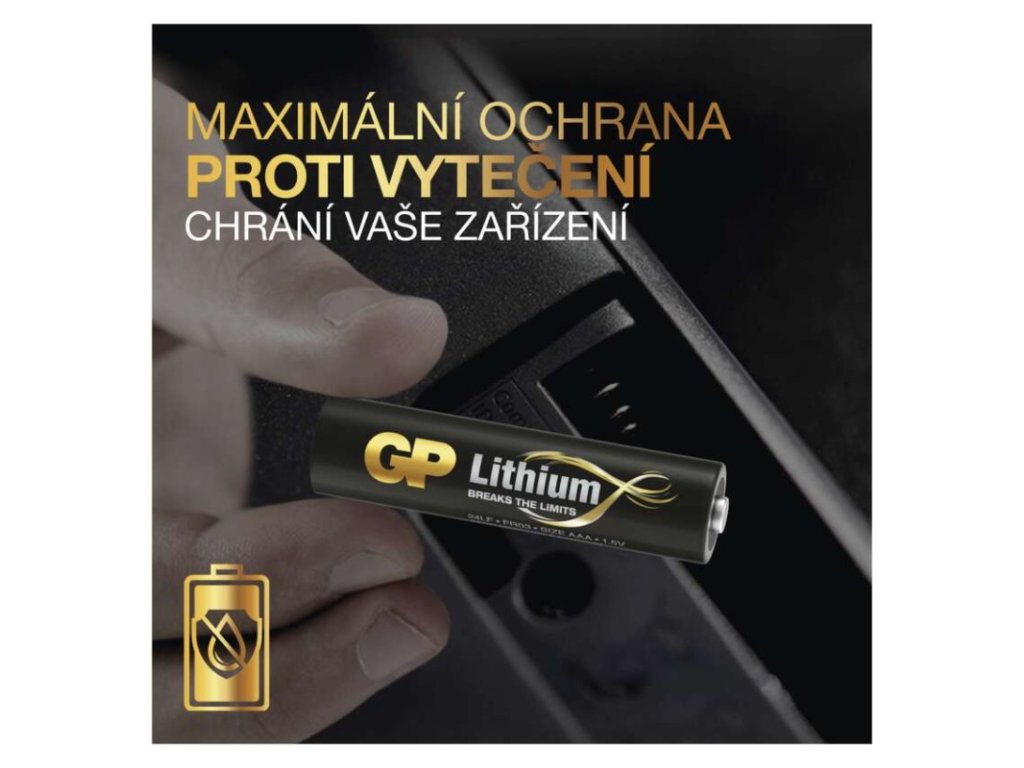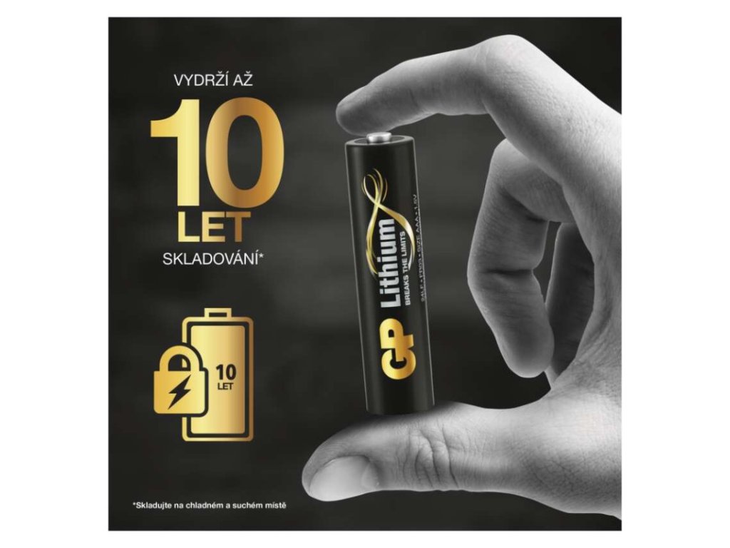 chemické složení: lithiové|hmotnost: 7,5 g|kapacita: neuvádí se|kategorie/řada: Lithium|max. skladovatelnost: 10 let|možnost nabíjení: ne|napětí: 1,5 V|počet nabíjecích cyklů: nenabíjecí|prodejní obal: 2 ks, blistr|provozní teplota: -40 °C až +60 °C|rozměr: 10,5 × 44,5 mm|typ: FR03 (mikrotužka, AAA)|velikost baterie: AAA|značka: GPDoplňkové parametry