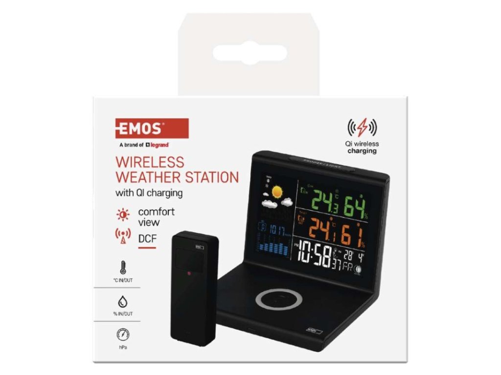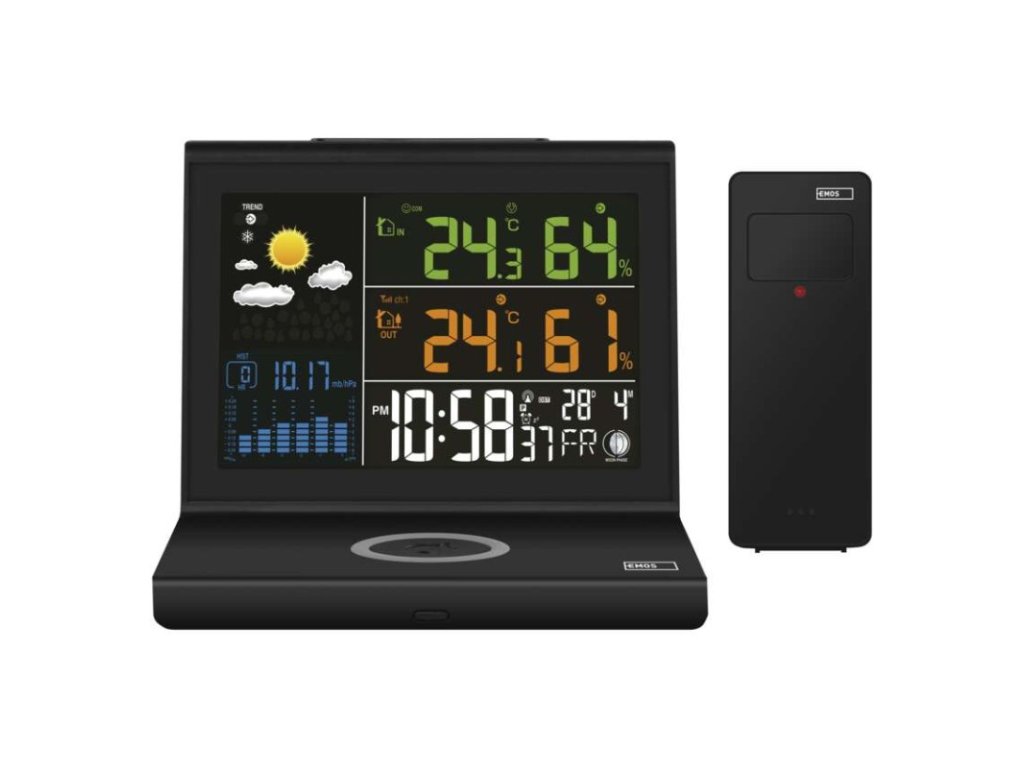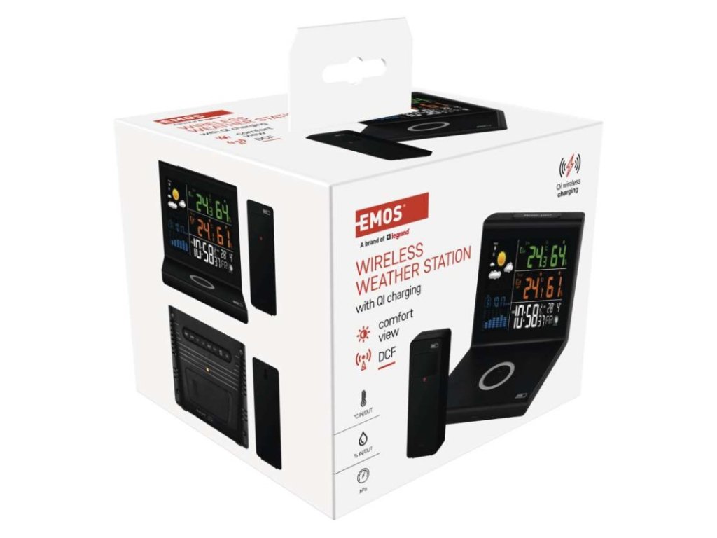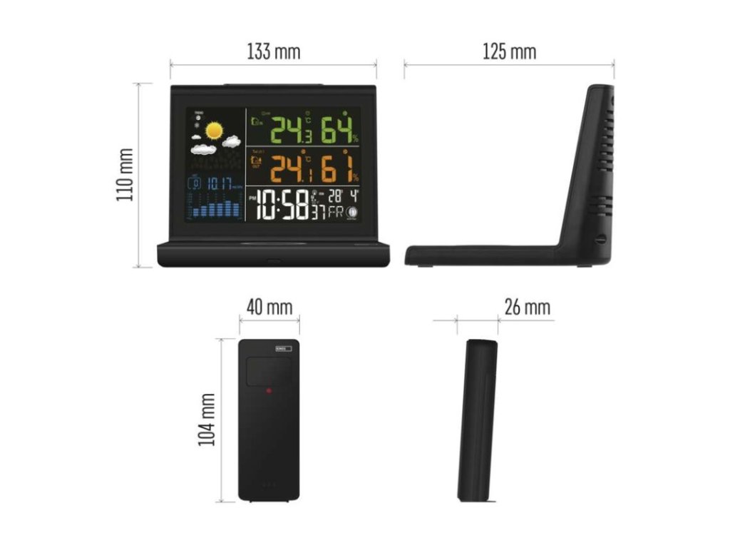 12/24 formát času: ano|anemometr: ne|barevný displej (black mask) podsvícený: ano|barometr: ano|budík: ano|časová pásma: ano|datum: ano|dosah čidla: až 100 m|drátová sonda k čidlu: ne|elektronické plošné podsvícení: ano|fáze měsíce: ano|hodiny: řízené DCF signálem|kalendář: ano|korekce nadmořské výšky: ne|LED podsvícení displeje: ano|min. a max. teplota: ano|možné další čidlo: až 3 čidla (E00387, E05018)|možnost nastavení jednotky teploty: °C/°F|možnost pověšení na zeď: ne|napájení čidla: 2× 1,5 V AAA (nejsou součástí balení)|napájení stanice: 2× 1,5 V AA (nejsou součástí balení)|opakované buzení: ano|předpověď počasí: ano|přenosová frekvence: 433 MHz|prodejní obal: 1 ks, krabička|produkt: meteostanice|projekce: ne|provedení: bezdrátové|rozměr čidla: 40 × 26 × 104 mm|rozměr hlavní jednotky: 133 × 125 × 110 mm|síťový adaptér: ano, USB-C 9 V DC/2 000 mA, 1,5 m (součástí balení)|srážkoměr: ne|teplotní výstraha: ano|trend teploty: ano|trend tlaku: ano|trvalé podsvícení: ano|velikost displeje: 110 × 73 mm|venkovní teplota: -50 °C až +70 °C, rozlišení 0,1 °C|venkovní vlhkost: 20 % až 95 % RV, rozlišení 1 %|vnitřní teplota: -2 °C až +50 °C, rozlišení 0,1 °C|vnitřní vlhkost: 20 % až 95 % RV, rozlišení 1 %Doplňkové parametry