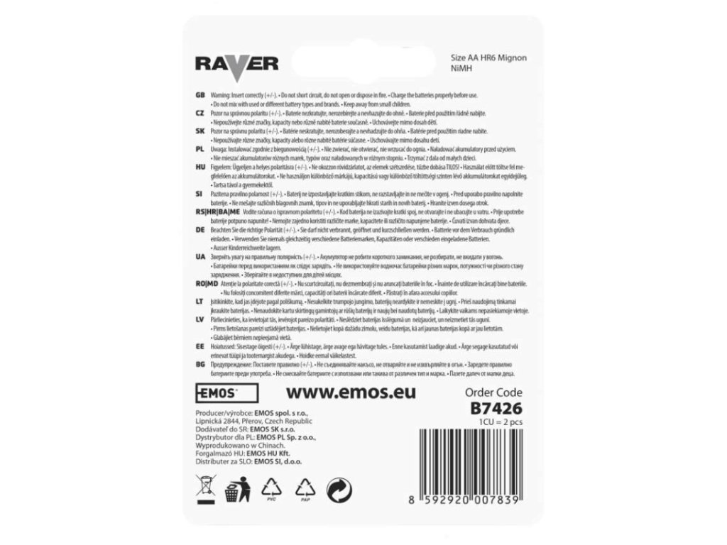 chemické složení: NiMH|hmotnost: 15 g|kapacita: 600 mAh|kategorie/řada: Solar|max. skladovatelnost: neuvádí se|možnost nabíjení: ano|napětí: 1,2 V|počet nabíjecích cyklů: více než 500|prodejní obal: 2 ks, blistr|provozní teplota: -20 °C až +50 °C|rozměr: 14,5 × 50,5 mm|typ: HR6 (tužka, AA)|velikost baterie: AA|značka: RaverDoplňkové parametry