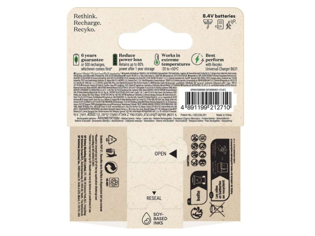 chemické složení: NiMH|hmotnost: 42,5 g|kapacita: 200 mAh|kategorie/řada: ReCyko|max. skladovatelnost: neuvádí se|možnost nabíjení: ano|napětí: 8,4 V|počet nabíjecích cyklů: více než 500|prodejní obal: 1 ks, papírová krabička|provozní teplota: -20 °C až +50 °C|rozměr: 26,5 × 15,7 × 48,5 mm|typ: 6HR61 9 V (1604)|velikost baterie: 9 V|značka: GPDoplňkové parametry