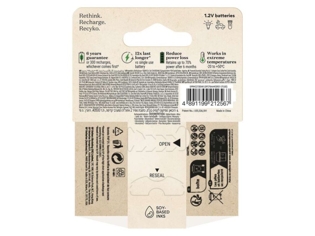 chemické složení: NiMH|hmotnost: 31 g|kapacita: 2 600 mAh|kategorie/řada: ReCyko|max. skladovatelnost: neuvádí se|možnost nabíjení: ano|napětí: 1,2 V|počet nabíjecích cyklů: více než 300|prodejní obal: 2 ks, papírová krabička|provozní teplota: -20 °C až +50 °C|rozměr: 14,5 × 50,5 mm|typ: HR6 (tužka, AA)|velikost baterie: AA|značka: GPDoplňkové parametry