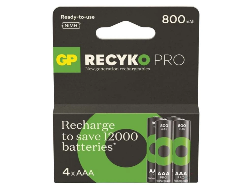 chemické složení: NiMH|hmotnost: 14 g|kapacita: 800 mAh|kategorie/řada: ReCyko Pro|max. skladovatelnost: neuvádí se|možnost nabíjení: ano|napětí: 1,2 V|počet nabíjecích cyklů: více než 1 500|prodejní obal: 4 ks, papírová krabička|provozní teplota: -20 °C až +50 °C|rozměr: 10,5 × 44,5 mm|typ: HR03 (mikrotužka, AAA)|velikost baterie: AAA|značka: GPDoplňkové parametry
