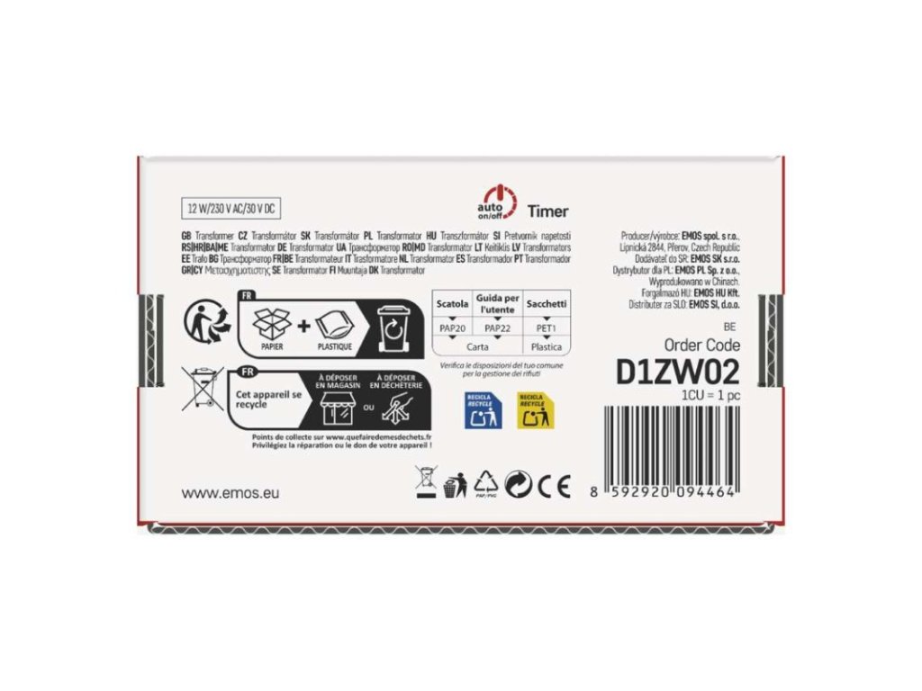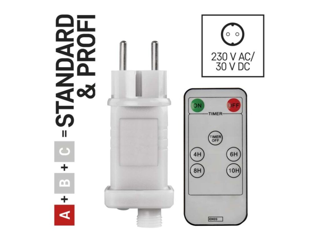 barva drátu: neuvádí se|časovač: ano|dálkový ovladač: ano (CR2032, součástí balení)|délka přívodu: neuvádí se|krytí: IP44|materiál: plast|max. počet propojení: standard 800 LED/profi 500 LED|použití: venkovní i vnitřní|příkon: 12 W|prodejní obal: 1 ks, krabice|produkt: adaptér|pro řadu: standard/profi|typ napájení: síťový adaptér|vstupní napětí: 230 V AC|výstupní napětí: 30 V DC|záruční doba: 2 roky|životnost: 5 000 hodinDoplňkové parametry