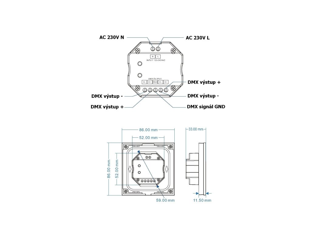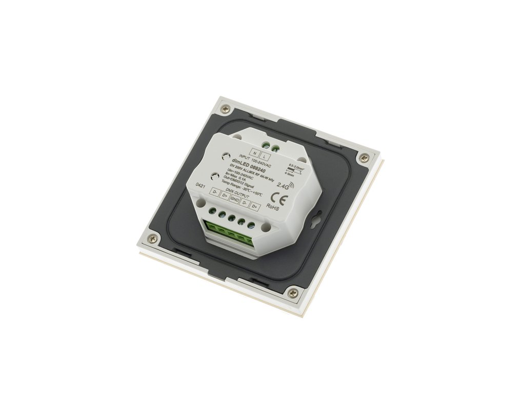 Dálkový ovladač dimLED OV 230V ALLMIX RF K4 je bezdrátový radiofrekvenční ovládací systém, jednoho ovladače a několik přijímačů. S jedním ovladačem lze ovládat nezávisle 4 zóny, která se může skládat z několika přijímačů. Tyto přijímače se po sehrání na jednotlivé předvolbě na ovladači ovládají jako jedna sekce. Zároveň součástí stmívače je master DMX512 výstup. Ovladač ALLMIX 4KM lze použít pro ovládání jednobarevných, CCT, RGB, RGBW a RGBCCT LED pásků. Jedním ovladačem tedy můžete například ovládat jak jednobarevné LED pásky, tak i RGB LED pásky, aniž byste museli mít 2 různé ovladače. Přijímač může být ukrytý (za zdí, sádrokartónem či ve skříni), není nutná přímá viditelnost přijímače pro ovladač. Vlastnosti a výhody systému dimLED: Stmívání je stabilní a spolehlivé, dosah ovladače ≤ 30M. Stmívání v rozmezí 0-100%, stmívání měkké, bez blikání. Při zapnutí dojde k pozvolnému rozsvícení, při vypnutí dojde k pozvolnému setmění. Specifikace ovladače: Vstupní napětí 85-265 VAC Přenosová frekvence 2,4GHz Dosah 30m Počet zón 4 samostatné Počet přijímačů Lze spárovat neomezeně přijímačů Rozměry 86 x 86 x 33 mm (lze namontovat na standartní EU krabici) Paměť posledního nastavení po odpojení napájení: ANO Stupeň krytí: IP20Doplňkové parametry