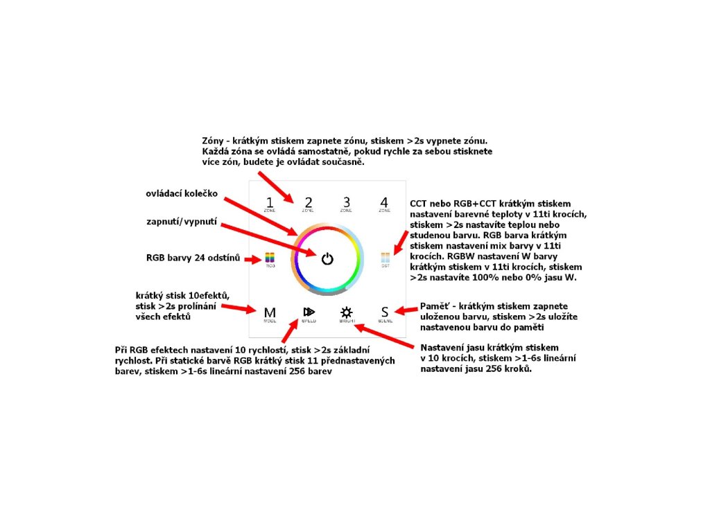 Barva ovládaného světla: | jednobarevný, RGB, RGBW, CCT, RGBCCT |