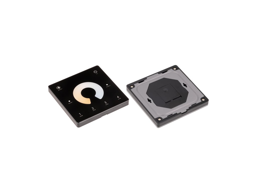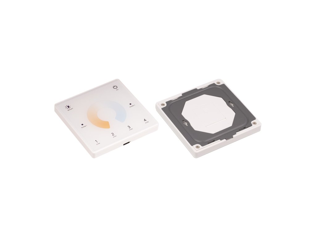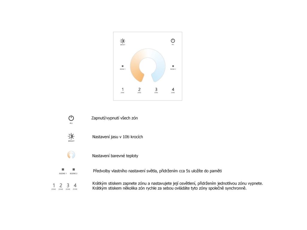 Čtyřkanálový LED ovladač OV PNS pro CCT osvětlení je bezdrátový radiofrekvenční ovládací systém jednoho ovladače a několik přijímačů. S jedním ovladačem lze ovládat nezávisle 4 zóny, která se mohou skládat z několika přijímačů. Tyto přijímače se po sehrání na jednotlivé předvolbě na ovladači ovládají jako jedna sekce. Přijímač může být ukrytý (za zdí, sádrokartónem či ve skříni), není nutná přímá viditelnost přijímače pro ovladač. Ovladač PNS je složen se samotného ovladače a rámečku. Tento rámeček lze přišroubovat na standartní EU krabic, případně přivrtat k jinému povrchu. Díky svému rovnému tvaru lze ovladač také přilepit na jakékoliv jiné místo například pomocí oboustranné lepicí pásky. Součástí balení: ovladač PNS šroubky 2ks oboustranná lepicí pásky k přilepení ovladače Ovládání ovladače PNS Ovládání probíhá na dotykové lince uprostřed ovladače. Dotykem na lince dochází k nastavování intenzity. Tlačítka na krajích ovladače slouží k dalším možnostem ovládání a vybírání zón. Vlastnosti a výhody systému dimLED Stmívání je stabilní a spolehlivé, dosah ovladače ≤ 30M. Stmívání v rozmezí 0-100%, stmívání měkké, bez blikání. Při zapnutí dojde k pozvolnému rozsvícení, při vypnutí dojde k pozvolnému setmění. Ovladač PNS: Ovládání probíhá na dotykové lince uprostřed ovladače. Dotykem na lince dochází k nastavování intenzity. Tlačítka na krajích ovladače slouží k dalším možnostem ovládání a vybírání zón. Specifikace ovladače: Barva ovládaného světla CCT Napájení ovladače Baterie - CR2032 (součástí balení) Přenosová frekvence 2,4GHz Dosah 30m Počet zón 4 samostatné Počet přijímačů Lze spárovat neomezeně přijímačů Rozměry 86 x 86 x 9,5 mm (lze namontovat na standartní EU krabici) Paměť posledního nastavení po odpojení napájení: ANO Stupeň krytí: IP20Doplňkové parametry