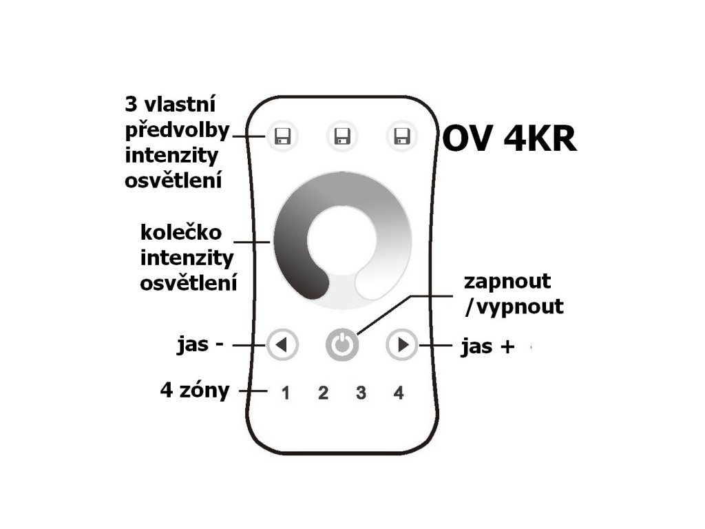 Dálkový ovladač dimLED OVS 4KR je bezdrátový radiofrekvenční ovládací systém, jednoho ovladače a několik přijímačů. S jedním ovladačem lze ovládat nezávisle 4 zóny, která se může skládat z několika přijímačů. Tyto přijímače se po sehrání na jednotlivé předvolbě na ovladači ovládají jako jedna sekce. Přijímač může být ukrytý (za zdí, sádrokartónem či ve skříni), není nutná přímá viditelnost přijímače pro ovladač. Vlastnosti a výhody systému dimLED: Stmívání je stabilní a spolehlivé, dosah ovladače ≤ 30M. Stmívání v rozmezí 0-100%, 256 úrovní stmívání, stmívání měkké, bez blikání. Při zapnutí dojde k pozvolnému rozsvícení, při vypnutí dojde k pozvolnému setmění. K ovladači lze dokoupit další držák na zeď. Specifikace ovladače: Napájen ovladače Baterie 2032 3V Přenosová frekvence 2,4GHz Dosah 30m Počet zón 4 nezávislé Synchronní ovládání vybraných zón Ano Počet přijímačů lze spárovat neomezeně přijímačů Rozměry 107 x 58,5 x 9mm Obsah balení ovladač, baterie, držák na zeď Paměť posledního nastavení po odpojení napájení: ANO Stupeň krytí: IP20Doplňkové parametry