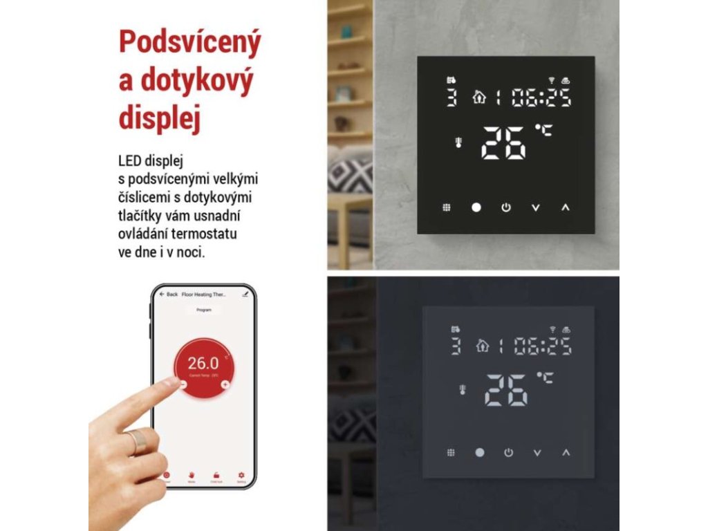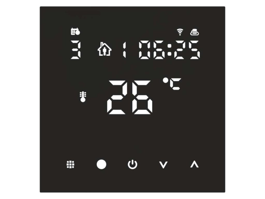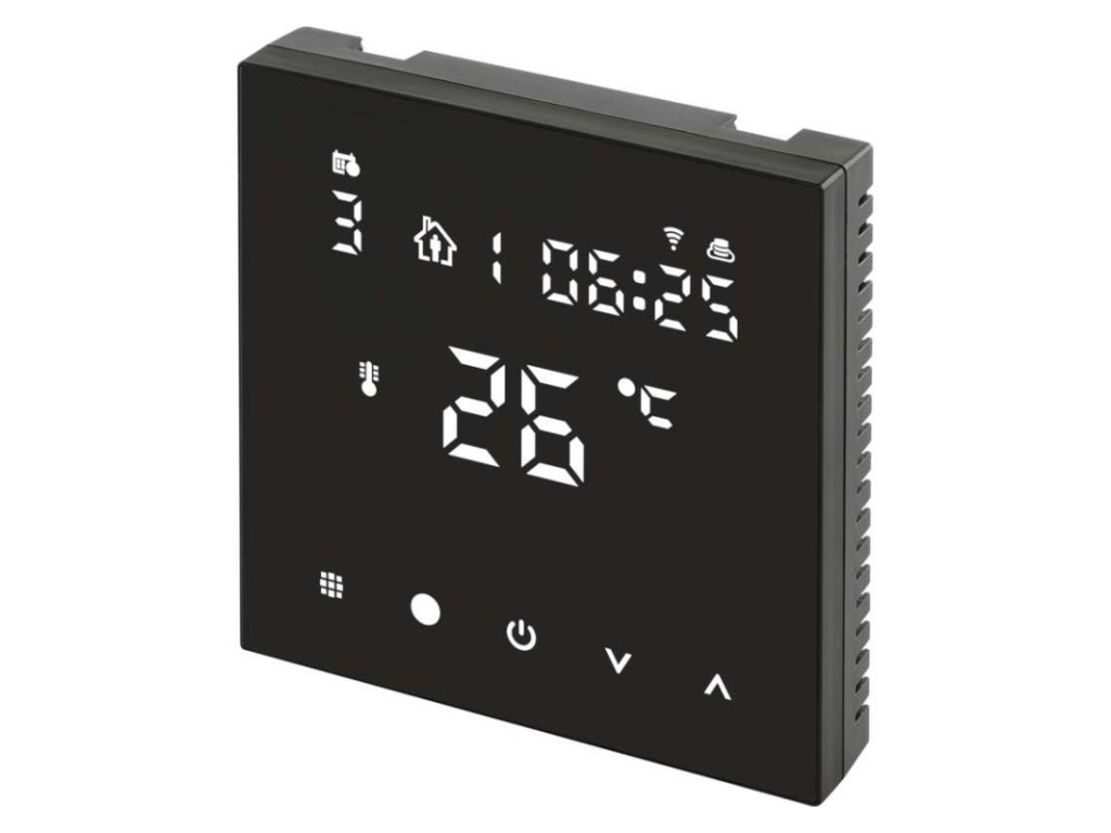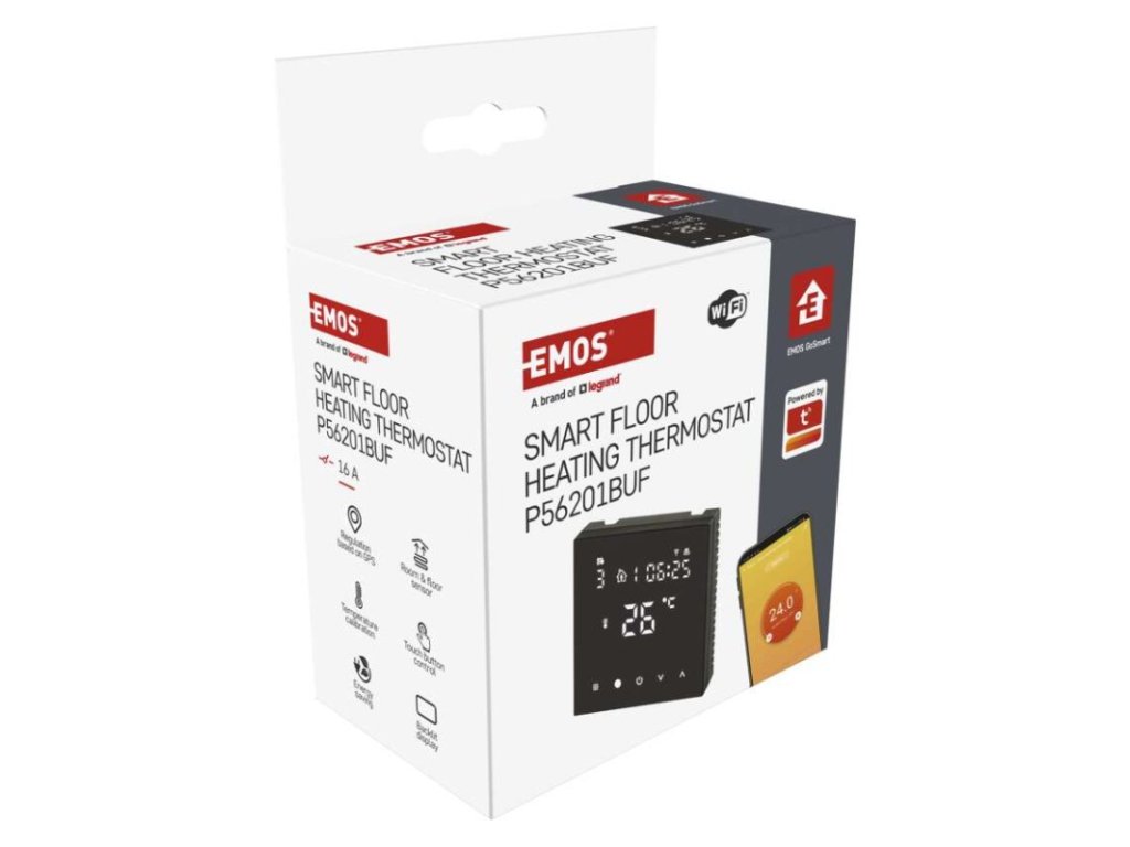 barva: černá|délka kapilárového čidla: neuvádí se|dosah ve volném prostoru: neuvádí se|druh regulace: vytápěcí systém|funkce ON/OFF: ano|funkce prázdniny: ano|funkce Set-back: ne|jazyky aplikace: EN, CZ, SK, PL, DE, HU, SI, FR, + 60 dalších jazyků|kalibrace teploty: ano|kompatibilita: EMOS GoSmart, TUYA, LIDL, Smartlife, Otevřený systém|měření teploty: 0 °C až 95 °C, rozlišení 0,5 °C|možnost propojení s dalšími detektory: neuvádí se|napájení: 230 V AC|napájení brány: neuvádí se|napájení přijímače: neuvádí se|napájení vysílače: neuvádí se|nastavení teploty: 1 °C až 70 °C, po 0,5 °C|nastavitelný rozptyl teploty: vnitřní čidlo: 0,5 °C až 2,5 °C, rozlišení 0,5 °C; podlahové čidlo: 1 °C až 9 °C, rozlišení 1 °C|notifikace do mobilní aplikace: ano|ochrana proti zamrznutí: ano|ovládání hlasovými asistenty: ano (Amazon Alexa, Google Assistant)|počet programů: uživatelsky nastavitelná teplota (6× za den)|podlahové čidlo: NTC 10 kΩ, 3 m|podporované OS: Android, iOS|podsvícený displej: ano|pracovní frekvence: neuvádí se|přenosová frekvence: 2,4 GHz WIFI (IEEE802.11b/g/n)|prodejní obal: 1 ks, krabička|protokol: Wi-Fi|rozměr: 86 × 86 × 43 mm|rozměr brány: neuvádí se|rozměr přijímače: neuvádí se|rozměr vysílače: neuvádí se|součást balení: termostat, podlahové čidlo 3 m, Ø 8 mm|spínaná zátěž: 16 A odporově|spínání: napěťové 230 V AC, 50 Hz|typ nastavení teploty: 6 teplotních změn denně|typ ovládání: programovatelný elektronický pokojový termostat, možnost ovládaní přes mobil (iOS, Android)|typ termostatu: drátový pro podlahové vytápění, podomítkovýDoplňkové parametry