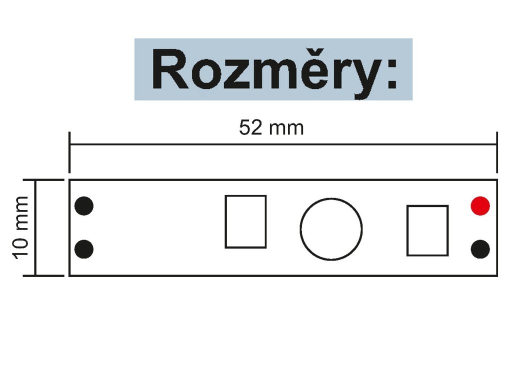 Spínač je svou konstrukcí určený k vestavění do ALU profilů s LED pásky. Jednoduchá konstrukce a snadné nastavení pouze času doby sepnutí (ne světelnosti zapnutí) zaručuje spolehlivost a bezproblémové ovládání pro všechny koncové uživatele. Specifikace LED stmívače Vstupní napětí 12-24VDC Maximální proud 8A Dosah čidla max 2m Úhel žáběru 120° Nastavení času cca 7 až 70s Rozměry viz.obrázek Stupeň krytí: IP20Doplňkové parametry