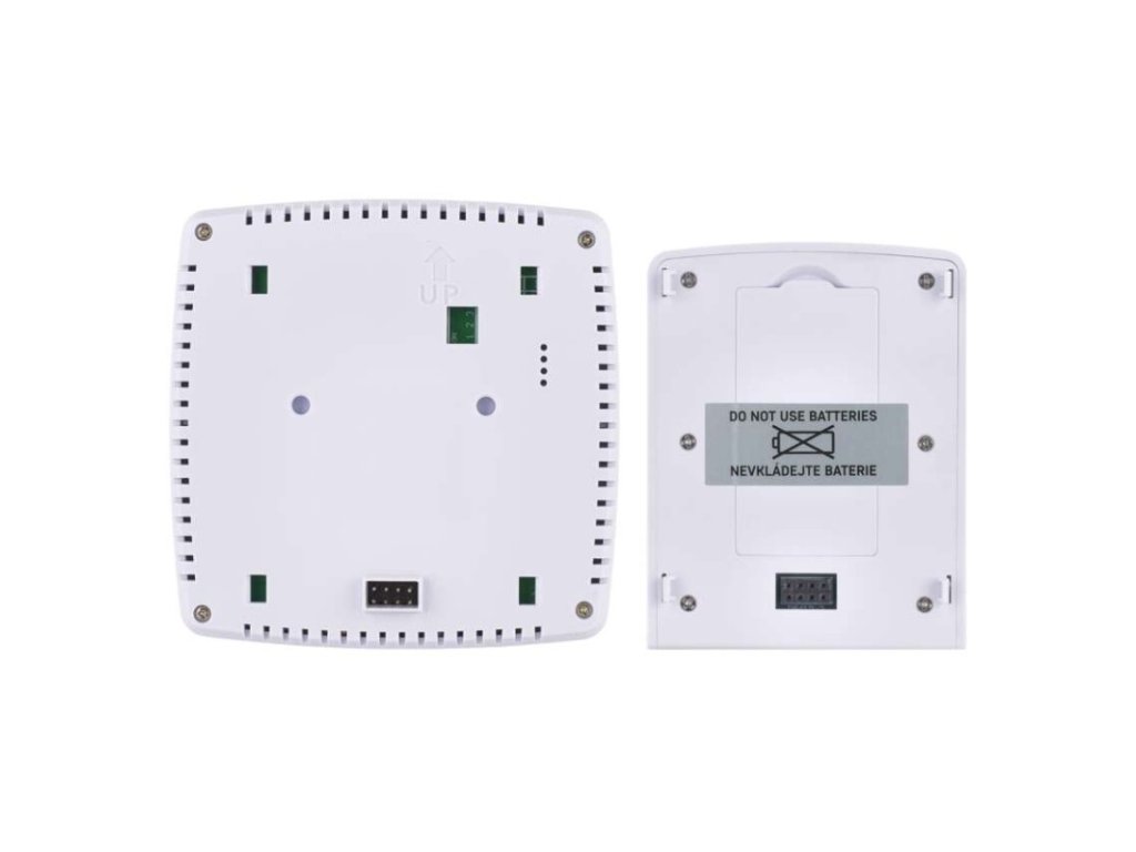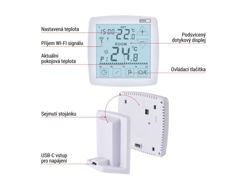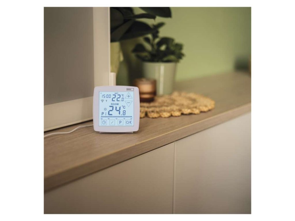 barva: bílá|délka kapilárového čidla: –|dosah ve volném prostoru: 100 m|druh regulace: vytápěcí a chladící systém|funkce ON/OFF: ano|funkce prázdniny: ano|funkce Set-back: ne|jazyky aplikace: EN, CZ, SK, PL, DE, HU, SI, FR, + 60 dalších jazyků|kalibrace teploty: ano|kompatibilita: EMOS GoSmart, TUYA, LIDL, Smartlife, Otevřený systém|měření teploty: 0 °C až 40 °C, rozlišení 0,1 °C|možnost propojení s dalšími detektory: ne|napájení: –|napájení brány: –|napájení přijímače: 230 V AC|napájení vysílače: 5 V USB adaptér (součástí dodávky)|nastavení teploty: 7 °C až 30 °C, po 0,2 °C|nastavitelný rozptyl teploty: 0,1 °C až 1 °C (rozlišení 0,1 °C)|notifikace do mobilní aplikace: ano|ochrana proti zamrznutí: ano|ovládání hlasovými asistenty: ano (Amazon Alexa, Google Assistant)|počet programů: 6 + 3 uživatelsky nastavitelné|podlahové čidlo: –|podporované OS: Android, iOS|podsvícený displej: ano|pracovní frekvence: 868 MHz|přenosová frekvence: 2,4 GHz WIFI (IEEE802.11b/g/n)|prodejní obal: 1 ks, krabička|protokol: Wi-Fi|rozměr: –|rozměr brány: –|rozměr přijímače: 115 × 37 × 91 mm|rozměr vysílače: 98 × 55 × 98 mm|součást balení: –|spínaná zátěž: 16 A odporově, 5 A induktivně|spínání: 230 V AC nebo beznapěťové|typ nastavení teploty: komfortní a úsporná teplota|typ ovládání: programovatelný elektronický pokojový termostat, možnost ovládaní přes mobil (iOS, Android)|typ termostatu: bezdrátový s OpenTherm komunikacíDoplňkové parametry