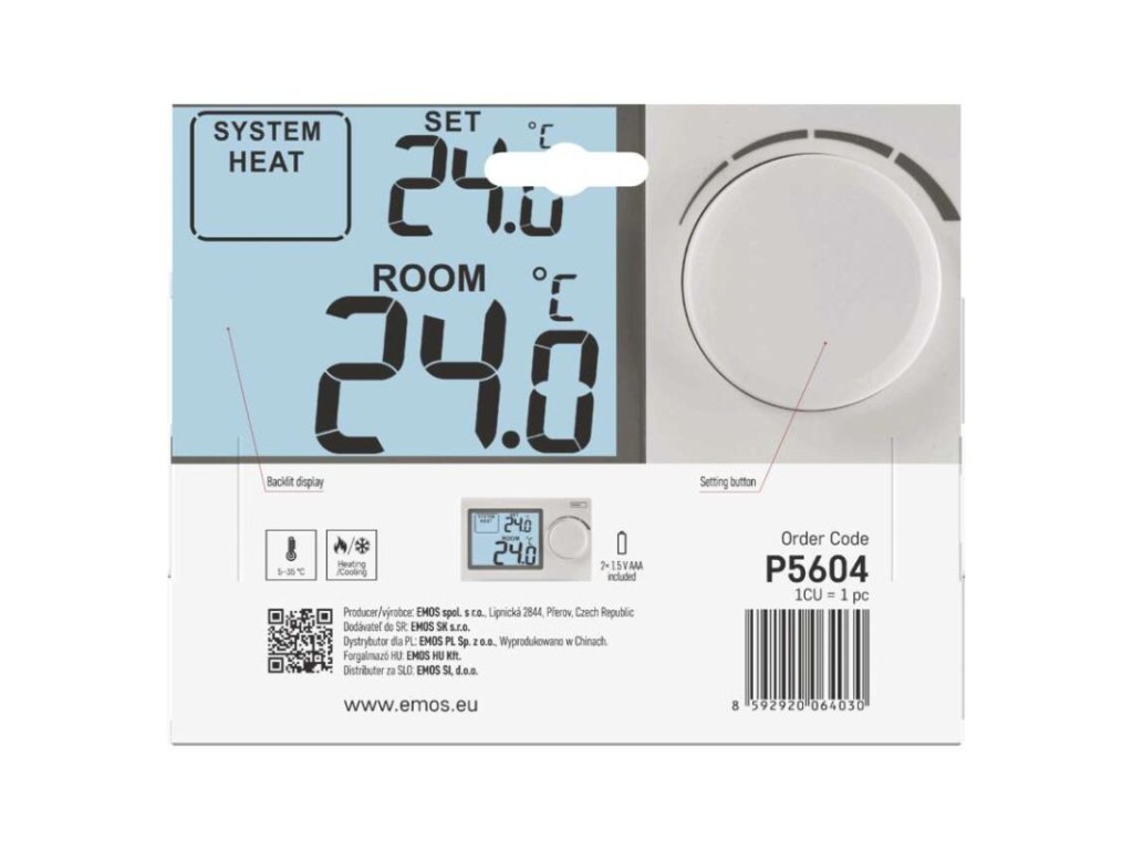 barva: bílá|délka kapilárového čidla: neuvádí se|dosah ve volném prostoru: neuvádí se|druh regulace: vytápěcí a chladící systém|funkce ON/OFF: ne|funkce prázdniny: ne|funkce Set-back: ne|kalibrace teploty: ano|měření teploty: 0 °C až 40 °C, rozlišení 0,1 °C|možnost propojení s dalšími detektory: neuvádí se|napájení: 2× 1,5 V AAA (součástí dodávky)|napájení brány: neuvádí se|napájení přijímače: neuvádí se|napájení vysílače: neuvádí se|nastavení teploty: 5 °C až 35 °C, po 0,5 °C|nastavitelný rozptyl teploty: ±0,2 °C|ochrana proti zamrznutí: ano|počet programů: uživatelsky nastavitelná teplota|podsvícený displej: ano|pracovní frekvence: neuvádí se|prodejní obal: 1 ks, krabička|protokol: –|rozměr: 30 × 120 × 77 mm|rozměr brány: neuvádí se|rozměr přijímače: neuvádí se|rozměr vysílače: neuvádí se|součást balení: neuvádí se|spínaná zátěž: 8 A odporově, 2 A induktivně|spínání: 230 V AC nebo beznapěťové|typ nastavení teploty: manuálně|typ ovládání: manuální pokojový termostat|typ termostatu: drátovýDoplňkové parametry