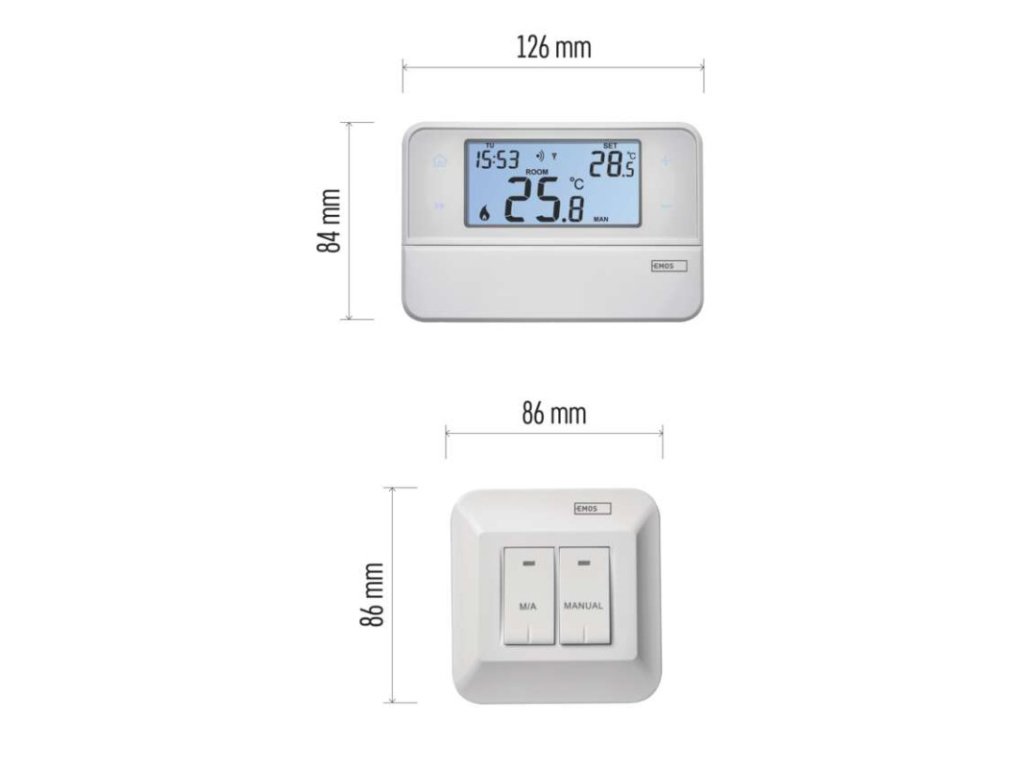 barva: bílá|délka kapilárového čidla: neuvádí se|dosah ve volném prostoru: 80 m|druh regulace: vytápěcí a chladící systém|funkce ON/OFF: ano|funkce prázdniny: ano|funkce Set-back: ne|kalibrace teploty: ano|měření teploty: 0 °C až 40 °C, rozlišení 0,1 °C|možnost propojení s dalšími detektory: neuvádí se|napájení: neuvádí se|napájení brány: neuvádí se|napájení přijímače: 230 V AC|napájení vysílače: 2× 1,5 V AA (součástí dodávky)|nastavení teploty: 5 °C až 35 °C, po 0,5 °C|nastavitelný rozptyl teploty: 0,2 °C až 2 °C, po 0,1 °C|ochrana proti zamrznutí: ano|počet programů: 1 uživatelsky nastavitelný program nebo uživatelsky nastavitelná teplota (6× za den)|podsvícený displej: ano|pracovní frekvence: 868 MHz|prodejní obal: 1 ks, krabička|protokol: –|rozměr: neuvádí se|rozměr brány: neuvádí se|rozměr přijímače: 26 × 86 × 86 mm|rozměr vysílače: 26 × 126 × 84 mm|součást balení: neuvádí se|spínaná zátěž: 10 A odporově, 4 A induktivně|spínání: 230 V AC nebo beznapěťové|typ nastavení teploty: 6 teplotních změn denně|typ ovládání: programovatelný elektronický pokojový termostat|typ termostatu: bezdrátový s OpenTherm komunikacíDoplňkové parametry