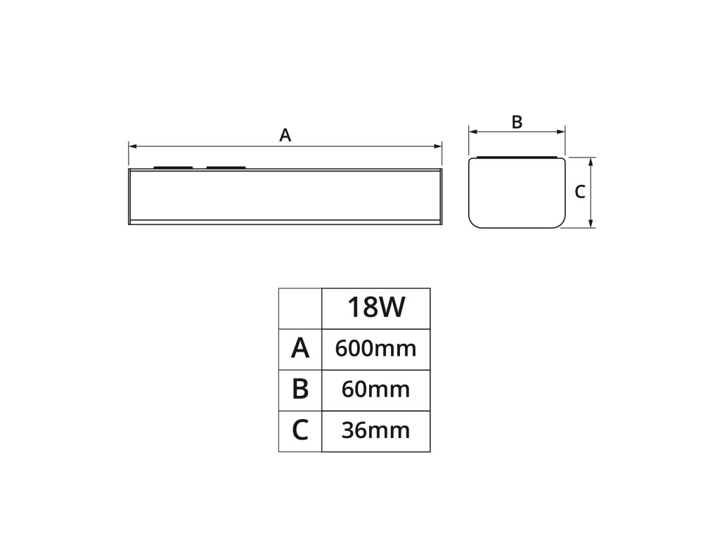 Bílé lineární přisazené LED svítidlo BAGON o délce 60 cm je ideální volbou pro osvětlení různých prostor, jako jsou chodby, sklepy, menší sklady a haly, stejně jako pro použití jako podlinkové světlo v kuchyních. Svítidlo se snadno instaluje a přisazuje ke stropu nebo stěně. Jeho kompaktní úzký design a mléčný kryt rozptyluje světlo v místnosti a nabízí dostatečné osvětlení pro optimální viditelnost. Součást balení: LED svítidlo, 2 úchyty namontované na svítidle, 2 vruty, 2 hmoždinky Specifikace LED svítidla Kryt Mléčný Barva svítidla Bílá Barevná varianta Teplá bílá Denní bílá Studená bílá Teplota světla 3000K 4000K 6500K Světelný tok 1800lm 1850lm 1900lm CRI >80 Vstupní napětí 220-240V AC Příkon 18W Úhel svitu 180° Provozní teplota -15°C až max. 50°C Rozměry 600x60x36mm Krytí IP44 Životnost 25 000h PF 0,5 Spínací cyklus 15000x Záruka 2 rokyDoplňkové parametry
