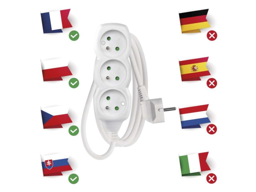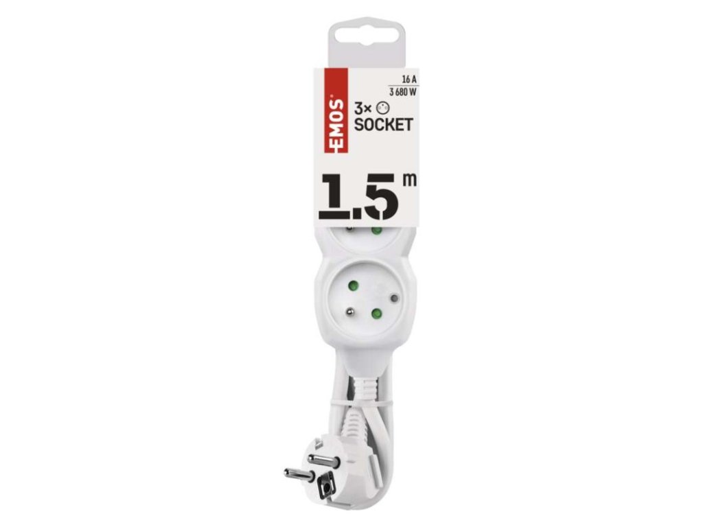barva: bílá|délka: 1,5 m|dětské clonky: ano|krytí: IP20|materiál zásuvky a vidlice: plast|max. zátěž: 3 680 W|napětí: 250 V~|počet zásuvek: 3|prodejní obal: 1 ks, závěs|proud: 16 A max.|průřez vodiče: 1,0 mm²|typ izolace: PVC|USB výstup: ne|vodič: H05VV-F3G|vypínač: neDoplňkové parametry