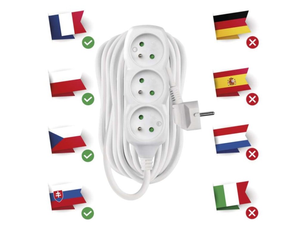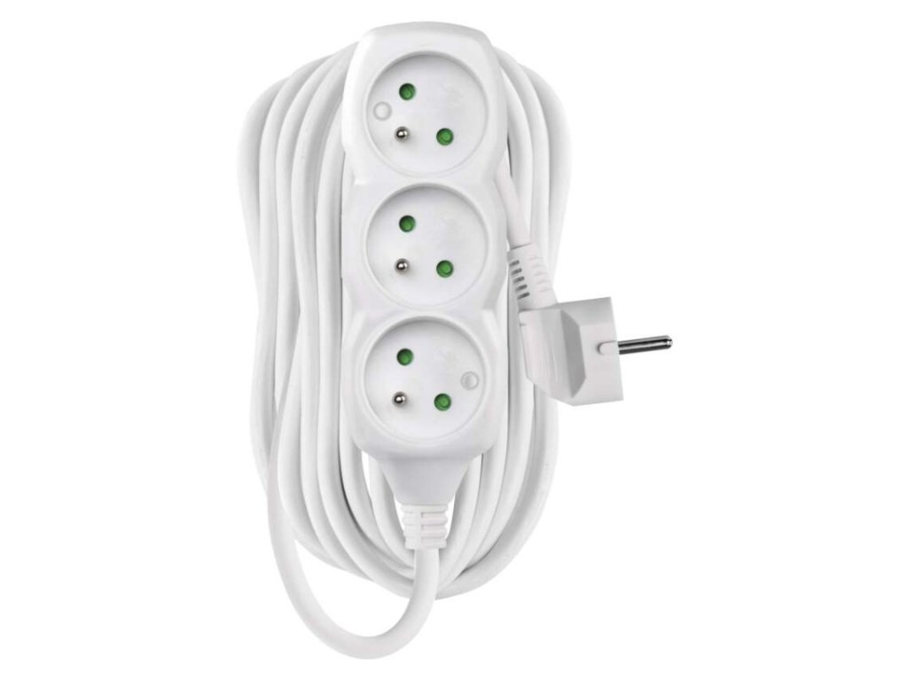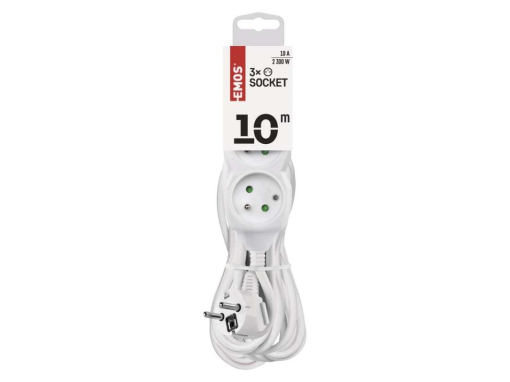 barva: bílá|délka: 10 m|dětské clonky: ano|krytí: IP20|materiál zásuvky a vidlice: plast|max. zátěž: 2 300 W|napětí: 250 V~|počet zásuvek: 3|prodejní obal: 1 ks, závěs|proud: 10 A max.|průřez vodiče: 1,0 mm²|typ izolace: PVC|USB výstup: ne|vodič: H05VV-F3G|vypínač: neDoplňkové parametry