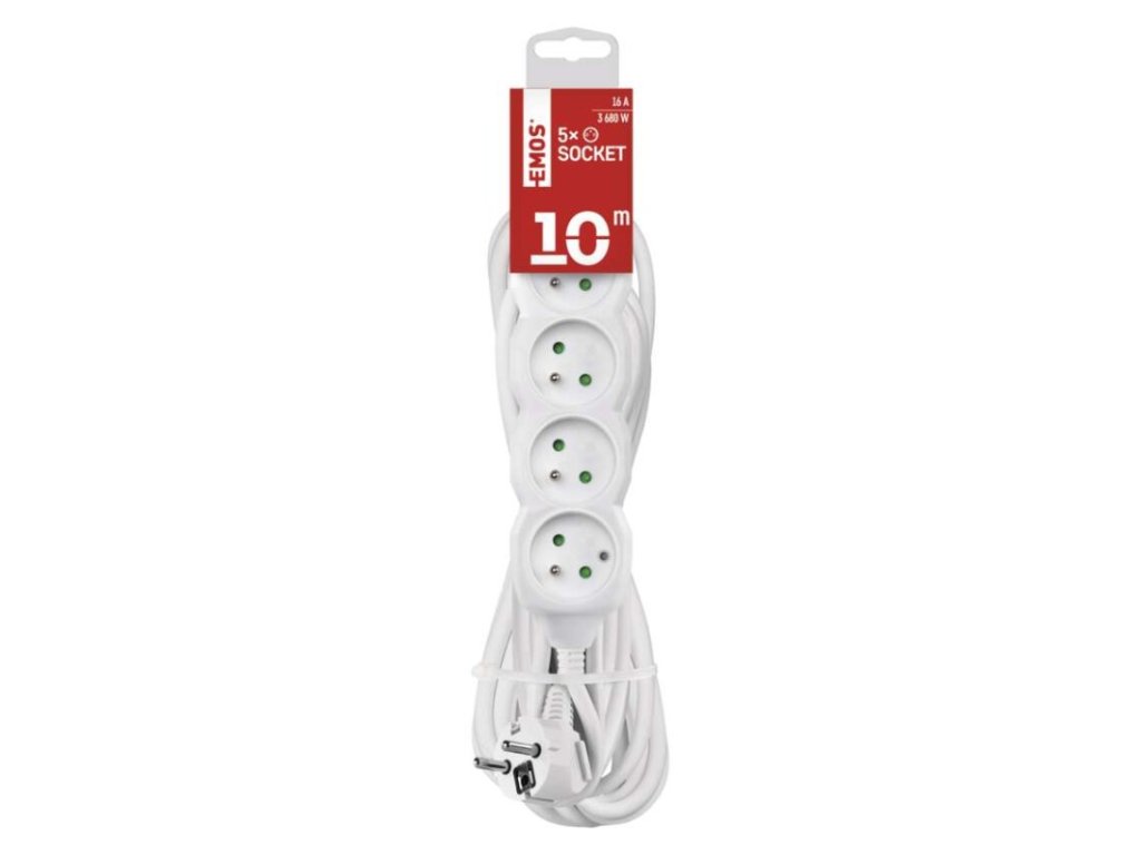 barva: bílá|délka: 10 m|dětské clonky: ano|krytí: IP20|materiál zásuvky a vidlice: plast|max. zátěž: 3 680 W|napětí: 250 V~|počet zásuvek: 5|prodejní obal: 1 ks, závěs|proud: 16 A max.|průřez vodiče: 1,5 mm²|typ izolace: PVC|USB výstup: ne|vodič: H05VV-F3G|vypínač: neDoplňkové parametry