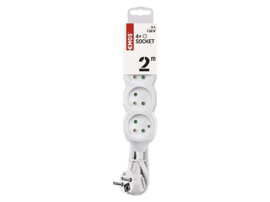 barva: bílá|další funkce: ne|délka: 2 m|dětské clonky: ano|jazyky aplikace: –|kompatibilita: –|krytí: IP20|materiál zásuvky a vidlice: plast|max. zátěž: 3 680 W|napětí: 250 V~|notifikace do mobilní aplikace: ne|ovládání hlasovými asistenty: ne|počet zásuvek: 4|podporované OS: –|přenosová frekvence: –|prodejní obal: 1 ks, závěs|protokol: –|proud: 16 A max.|průřez vodiče: 1,0 mm²|typ izolace: PVC|USB výstup: ne|vodič: H05VV-F3G|vypínač: neDoplňkové parametry