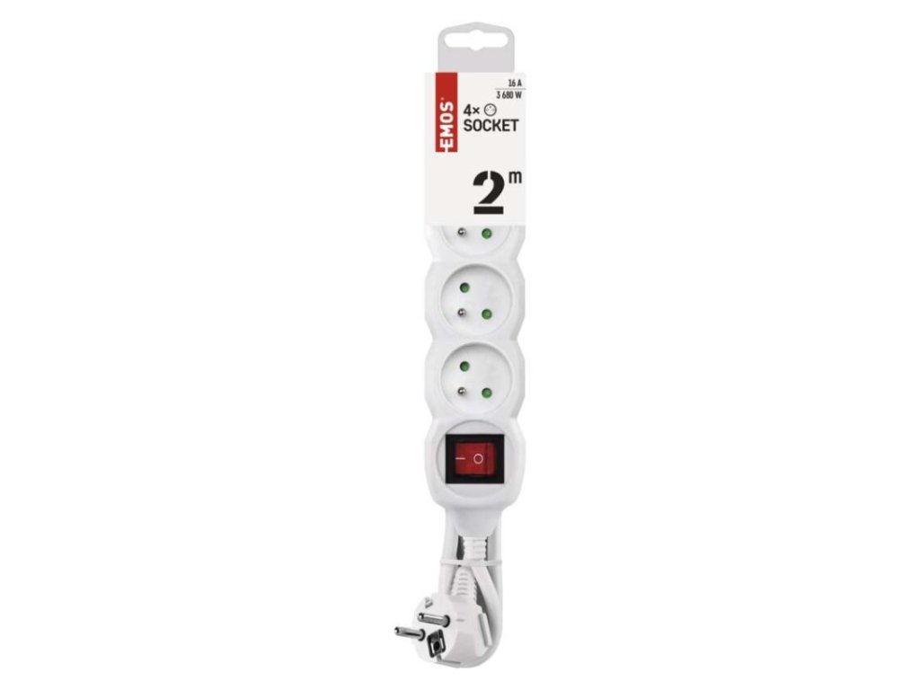 barva: bílá|další funkce: ne|délka: 2 m|dětské clonky: ano|jazyky aplikace: –|kompatibilita: –|krytí: IP20|materiál zásuvky a vidlice: plast|max. zátěž: 3 680 W|napětí: 250 V~|notifikace do mobilní aplikace: ne|ovládání hlasovými asistenty: ne|počet zásuvek: 4|podporované OS: –|přenosová frekvence: –|prodejní obal: 1 ks, závěs|protokol: –|proud: 16 A max.|průřez vodiče: 1,0 mm²|typ izolace: PVC|USB výstup: ne|vodič: H05VV-F3G|vypínač: anoDoplňkové parametry