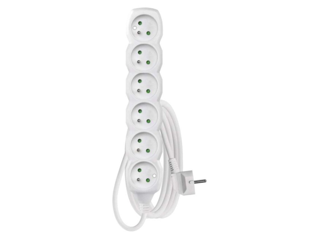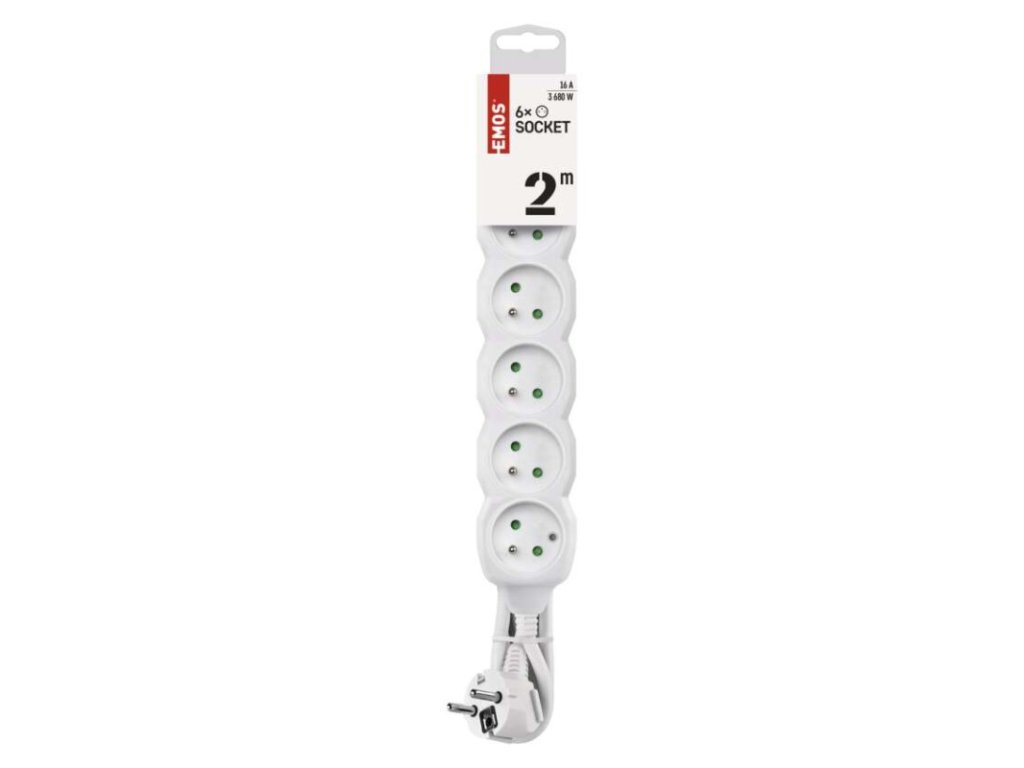 barva: bílá|další funkce: ne|délka: 2 m|dětské clonky: ano|jazyky aplikace: –|kompatibilita: –|krytí: IP20|materiál zásuvky a vidlice: plast|max. zátěž: 3 680 W|napětí: 250 V~|notifikace do mobilní aplikace: ne|ovládání hlasovými asistenty: ne|počet zásuvek: 6|podporované OS: –|přenosová frekvence: –|prodejní obal: 1 ks, závěs|protokol: –|proud: 16 A max.|průřez vodiče: 1,0 mm²|typ izolace: PVC|USB výstup: ne|vodič: H05VV-F3G|vypínač: neDoplňkové parametry