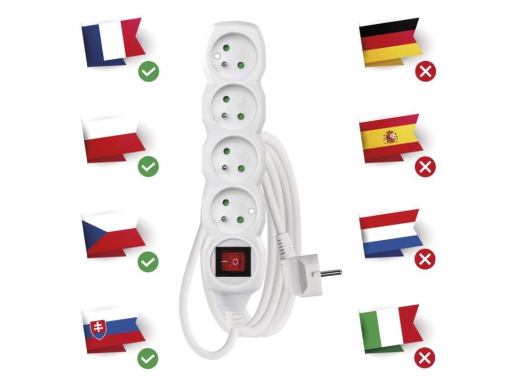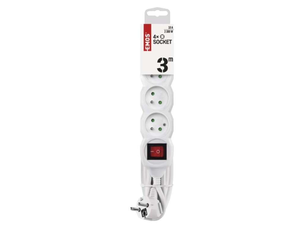 barva: bílá|délka: 3 m|dětské clonky: ano|krytí: IP20|materiál zásuvky a vidlice: plast|max. zátěž: 2 300 W|napětí: 250 V~|počet zásuvek: 4|prodejní obal: 1 ks, závěs|proud: 10 A max.|průřez vodiče: 1,0 mm²|typ izolace: PVC|USB výstup: ne|vodič: H05VV-F3G|vypínač: anoDoplňkové parametry