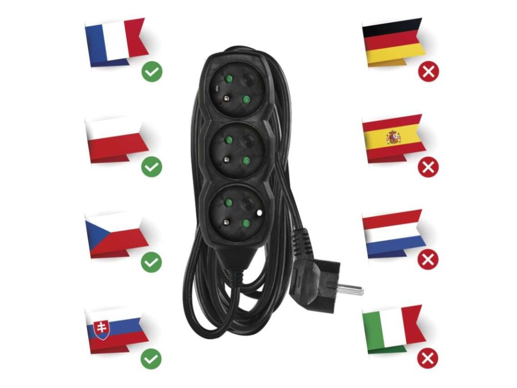 barva: černá|délka: 5 m|dětské clonky: ano|krytí: IP20|materiál zásuvky a vidlice: plast|max. zátěž: 2 300 W|napětí: 250 V~|počet zásuvek: 3|prodejní obal: 1 ks, závěs|proud: 10 A max.|průřez vodiče: 1,0 mm²|typ izolace: PVC|USB výstup: ne|vodič: H05VV-F3G|vypínač: neDoplňkové parametry