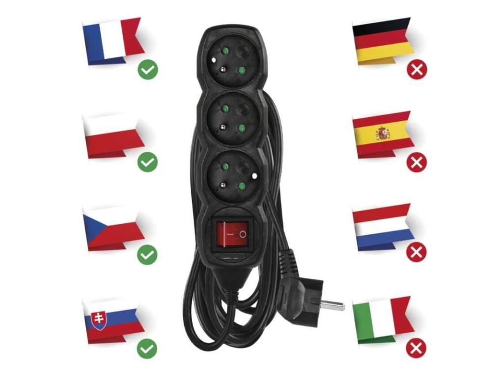 barva: černá|délka: 5 m|dětské clonky: ano|krytí: IP20|materiál zásuvky a vidlice: plast|max. zátěž: 2 300 W|napětí: 250 V~|počet zásuvek: 3|prodejní obal: 1 ks, závěs|proud: 10 A max.|průřez vodiče: 1,0 mm²|typ izolace: PVC|USB výstup: ne|vodič: H05VV-F3G|vypínač: anoDoplňkové parametry