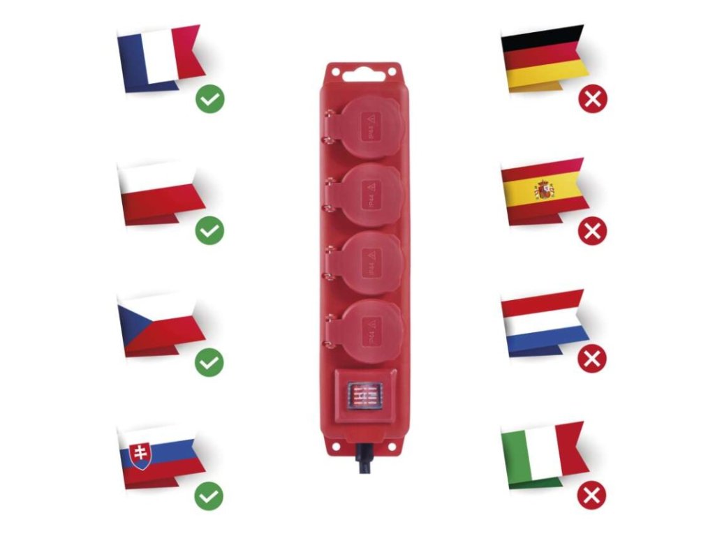 barva: černá/červená|délka: 5 m|dětské clonky: ano|krytí: IP44|materiál zásuvky a vidlice: plast/guma|max. zátěž: 3 680 W|napětí: 250 V~|počet zásuvek: 4|prodejní obal: 1 ks, fólie|proud: 16 A max.|průřez vodiče: 1,5 mm²|typ izolace: guma/neopren|USB výstup: ne|vodič: H07RN-F3G|vypínač: anoDoplňkové parametry