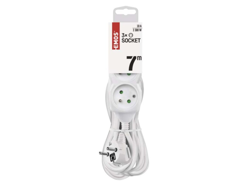 barva: bílá|délka: 7 m|dětské clonky: ano|krytí: IP20|materiál zásuvky a vidlice: plast|max. zátěž: 2 300 W|napětí: 250 V~|počet zásuvek: 3|prodejní obal: 1 ks, závěs|proud: 10 A max.|průřez vodiče: 1,0 mm²|typ izolace: PVC|USB výstup: ne|vodič: H05VV-F3G|vypínač: neDoplňkové parametry
